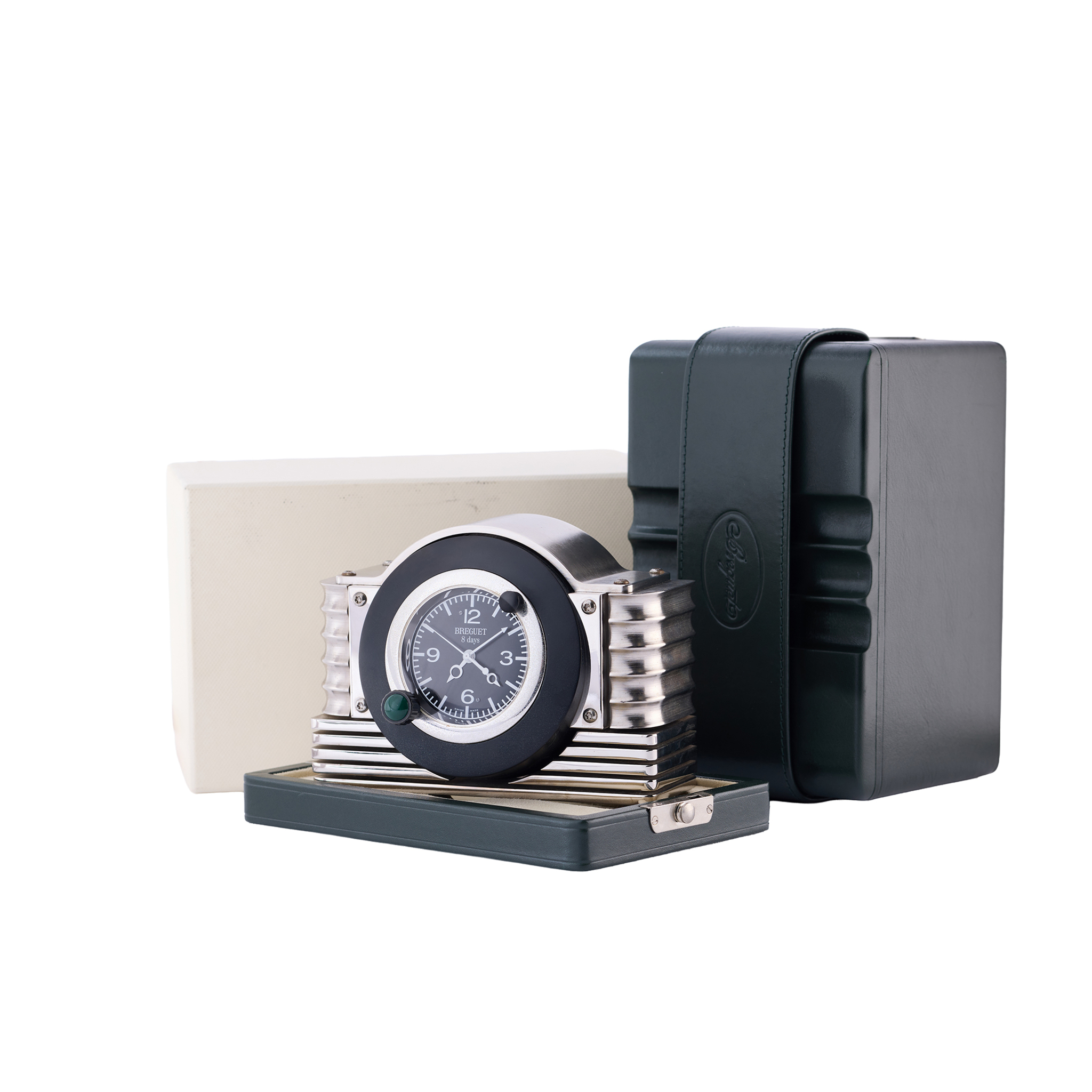 A fine, heavy and unusual, substantial, polished stainless steel, aluminium and black anodized, 8 days going keyless desk clock with chronograph and central progressive minute recording hand. made in a limited edition of 300 pieces from 1998 to 1999.