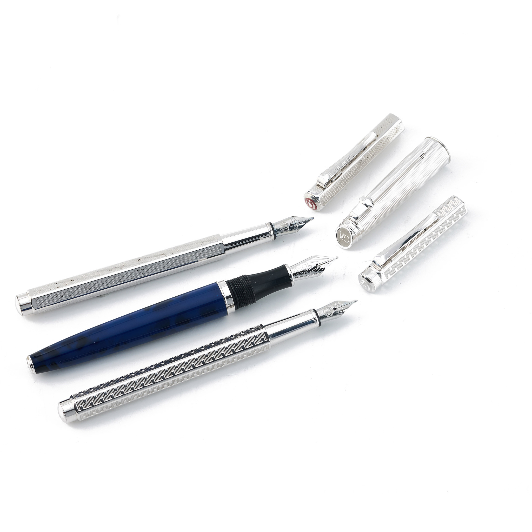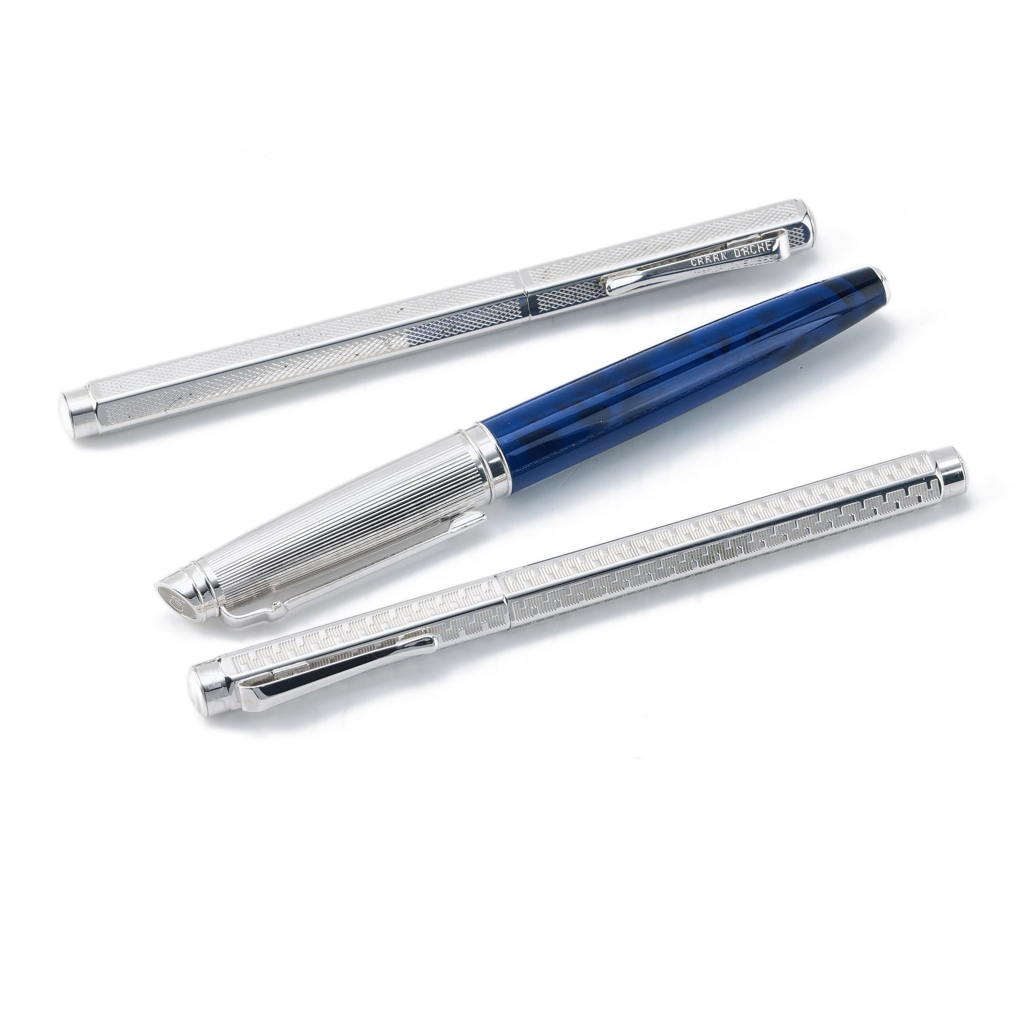 1) Geneve Blue Lacquer Fountain Pen. The barrel features an enamel finish in deep blue with swirling black accents, while the cap and fittings are coated in rhodium and silver. The cap showcases a pinstripe pattern, with “Caran d’Ache Swiss” engraved on the cap ring and the logo embellished on the cap top. The nib is crafted from 18K gold and coated in rhodium.