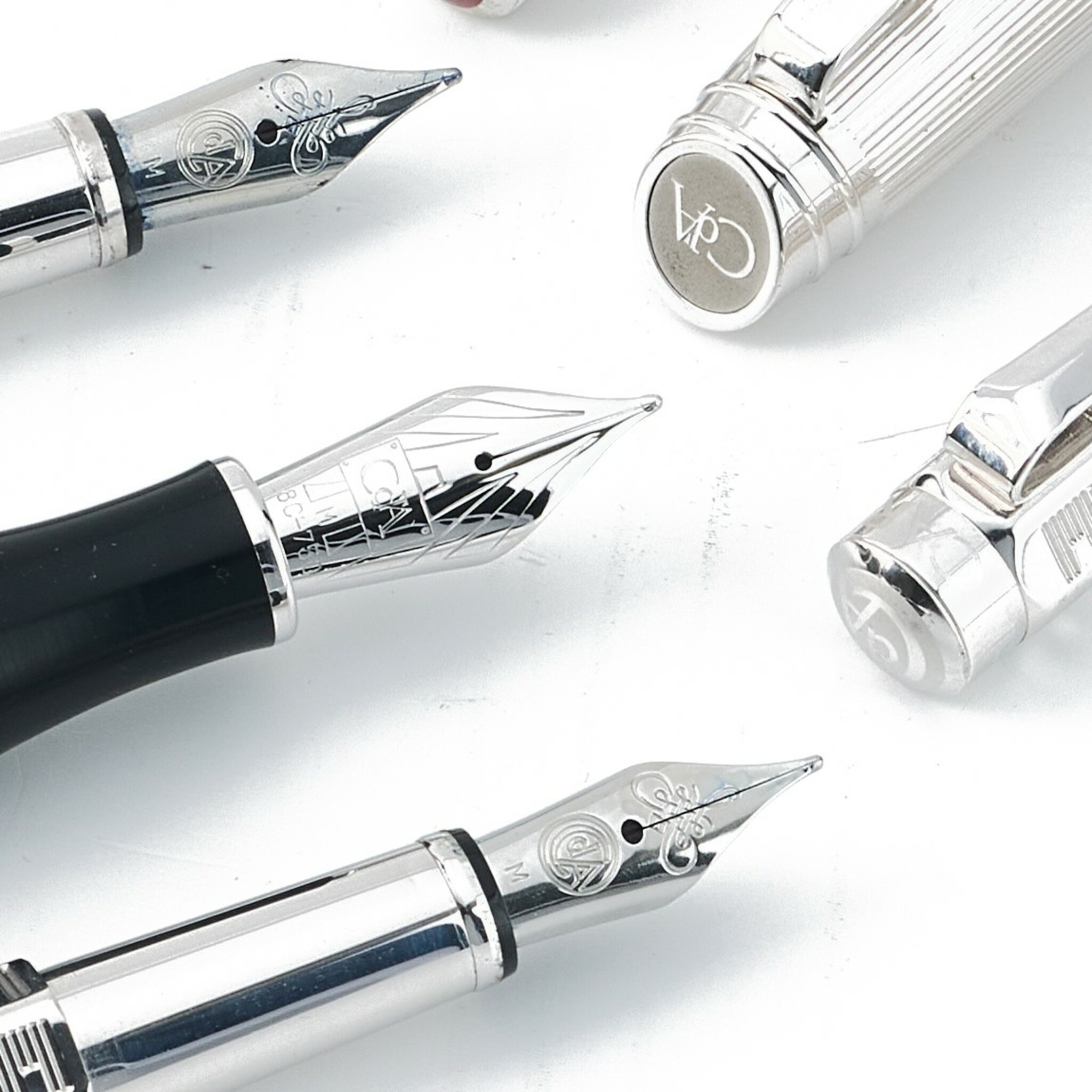 2) Ecridor Retro Fountain Pen. The hexagonal-shaped pen is adorned with a guilloché lozenge pattern and crafted in silver and palladium-coated brass, echoing the style of the 1947 mechanical pencils. The clip is engraved with “Caran D’Ache” and “Fabrication Swiss,” while the base bears the inscription “Clip Metal.” The red-coloured logo is inlaid on the cap top, and the nib is made from rhodium-coated steel.