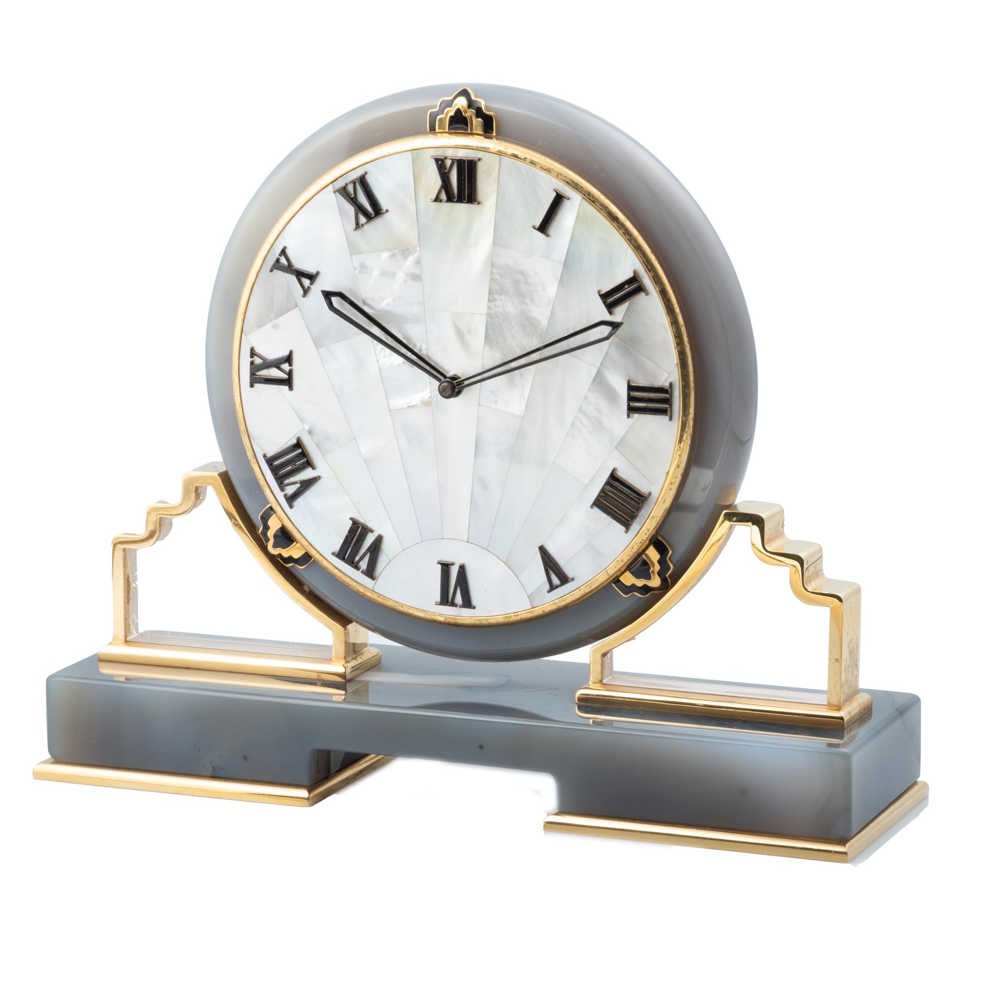 A fine, art deco style, gilt brass, rock crystal and agate, quartz clock with mother-of-pearl dial