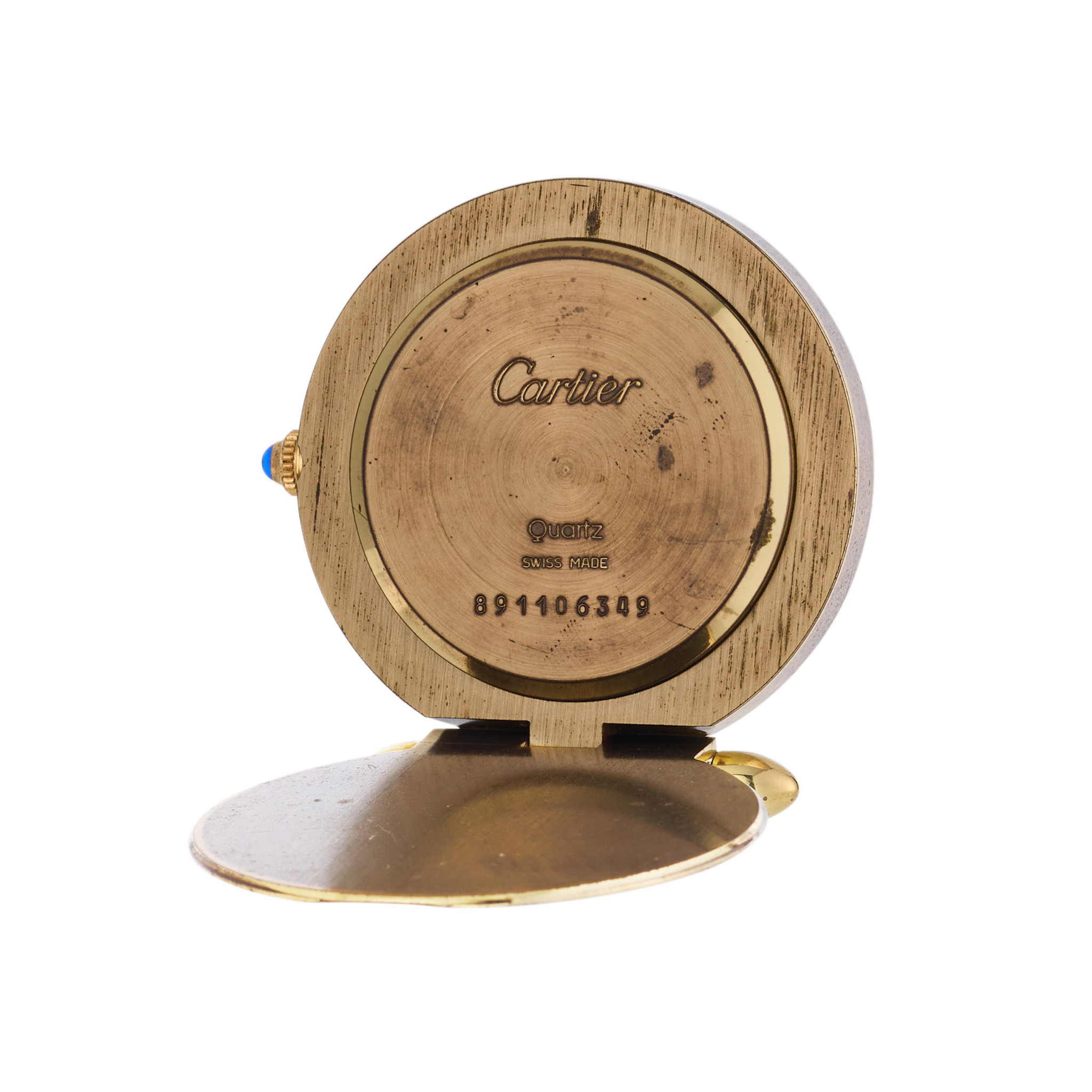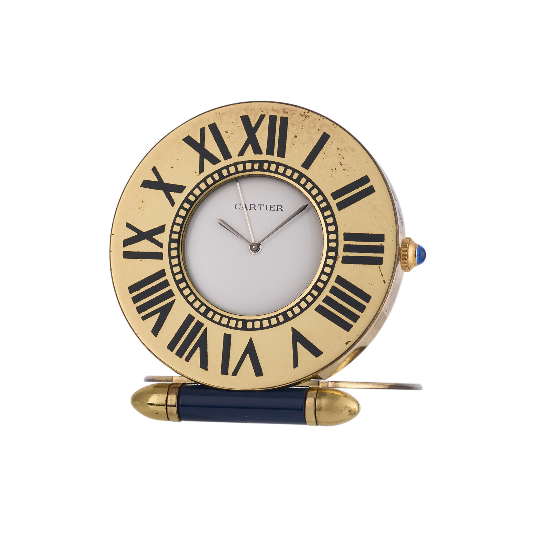 A fine and gilt brass round-shaped desk clock with alarm,with white dial and blue enamel painting hour indexes on the bezel, blue vendome-style hinged dial cover which can be used as a stand.