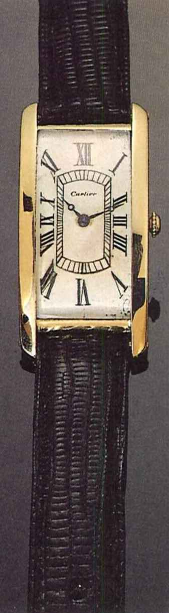 Very fine, large, rectangular curved 18-carat gold gentleman's wristwatch. C. massive, polished, 'bombé' crystal. D. mat silver with Roman numerals. Breguet blued steel hands. M 9"' signed European Watch & Clock Co. Inc., rhodiumed, 'fausses-cotes' decoration, 19 jewels, lever escapement, cut bimetallic balance adjusted to 8 position, flat balance-spring. Dial, case and movement signed. In good condition. 23 x 38 mm.