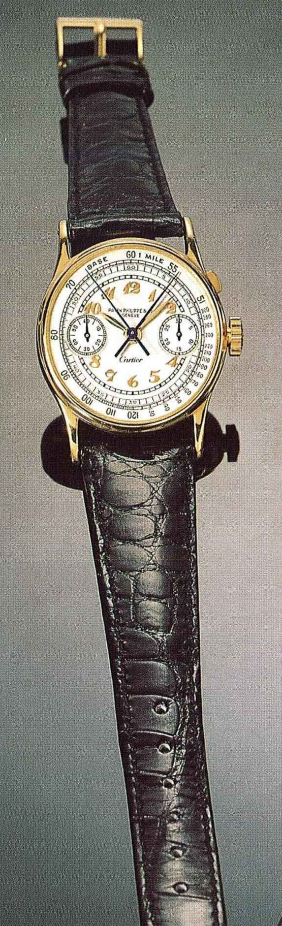 Patek Philippe & Cie, Genève, No. 198405, case No. 617297, Ref. 130, made for Cartier, No. 8703, sold on the 15.12.1938. Extremely rare and small 18-carat gold gentleman's wristwatch, with single button split seconds chronograph, register and tachometer.