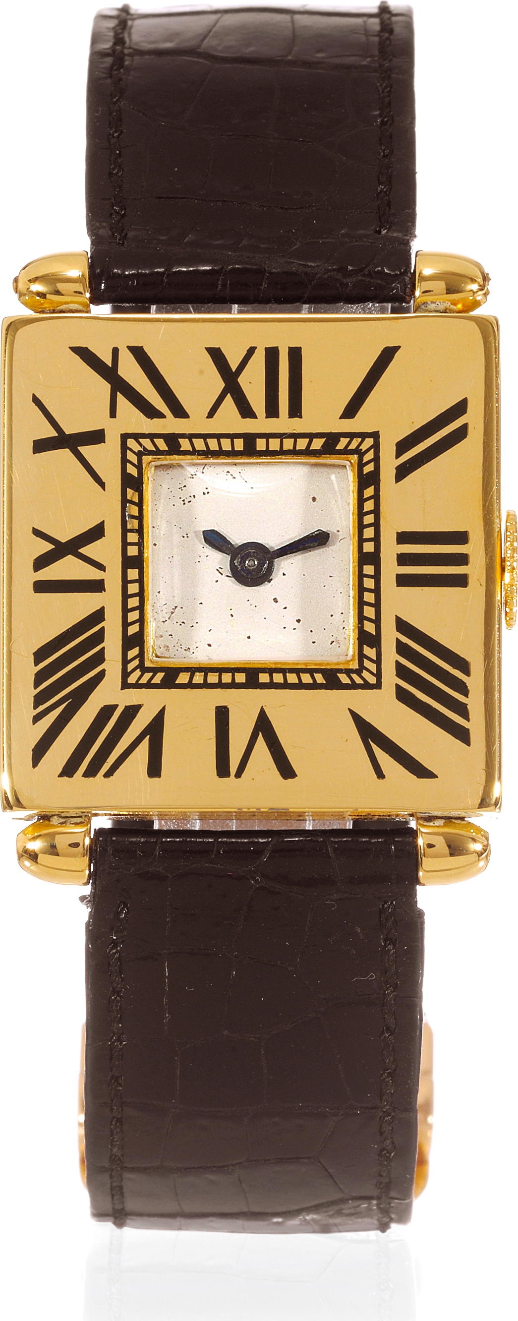 C. Square, two-body, solid, polished, four screws on the band, ogival lugs, black champleve radial Roman numerals on the wide bezel, inner minute track, the back decorated with a dark blue champleve enamel St. Christopher and the inscription ?EXALTATION, 1901-1927, Paris and After?. D. Small, square, matte silver. Blued steel épée hands. M. Cal. 10''', signed European Watch and Clock Co. Inc., rhodiumplated, fausses cotes decoration, 18 jewels, straight-line lever escapement, cut bimetallic compensation balance adjusted to 8 positions, blued steel Breguet balance spring, index regulator. Movement signed European Watch & Clock Co., Inc., case with Cartier numbers. Dim. 26 x 26 mm. Thickness 6 mm.