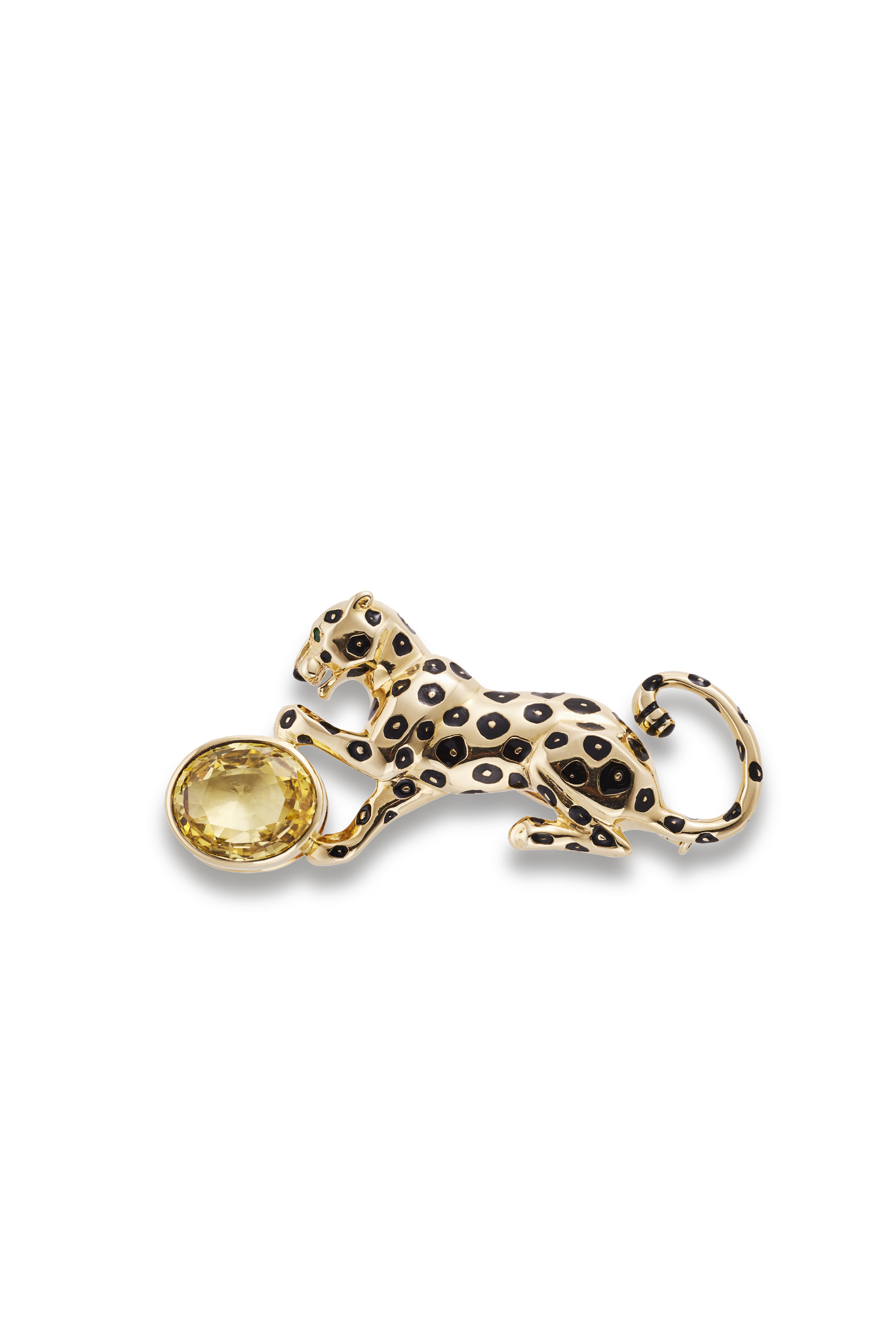 Cartier signed and number yellow gold and lacquer brooch in vintage panther design, set with one yellow sapphire at approximately 10 carat, and two emeralds. Number: 674929 Size: 5.7cm Weight: 18g Accompanied by certificate and service paper, and a box