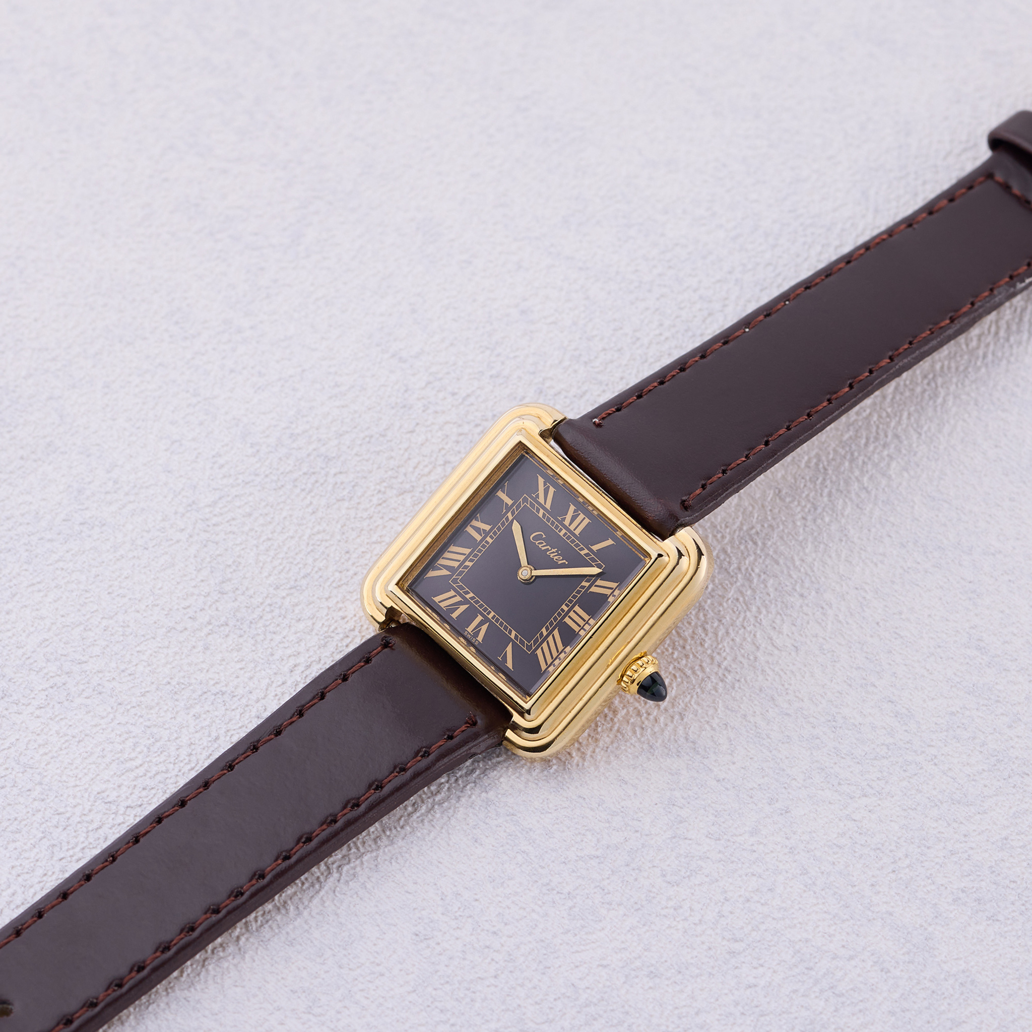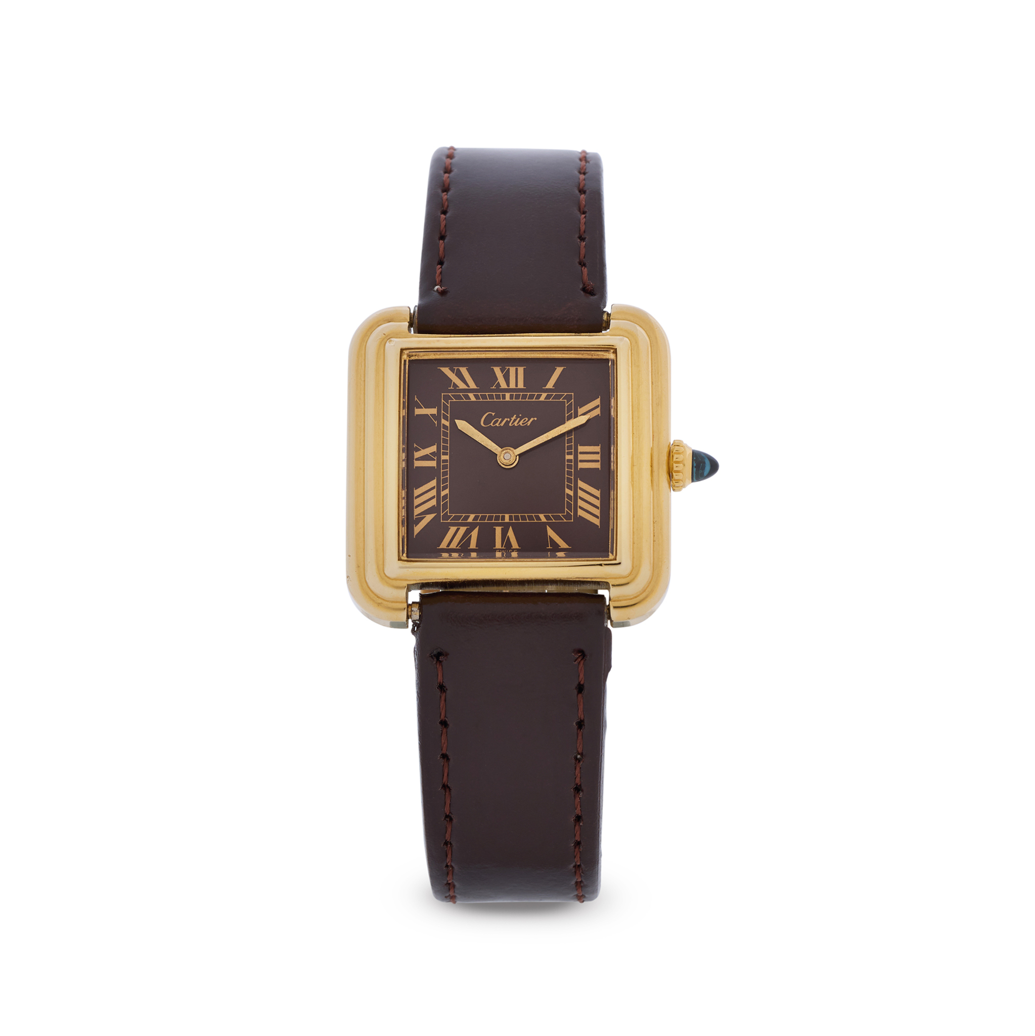 A very fine and elegant, 18k yellow gold electroplated, manual-winding square wristwatch with brown dial and stepped bezel.