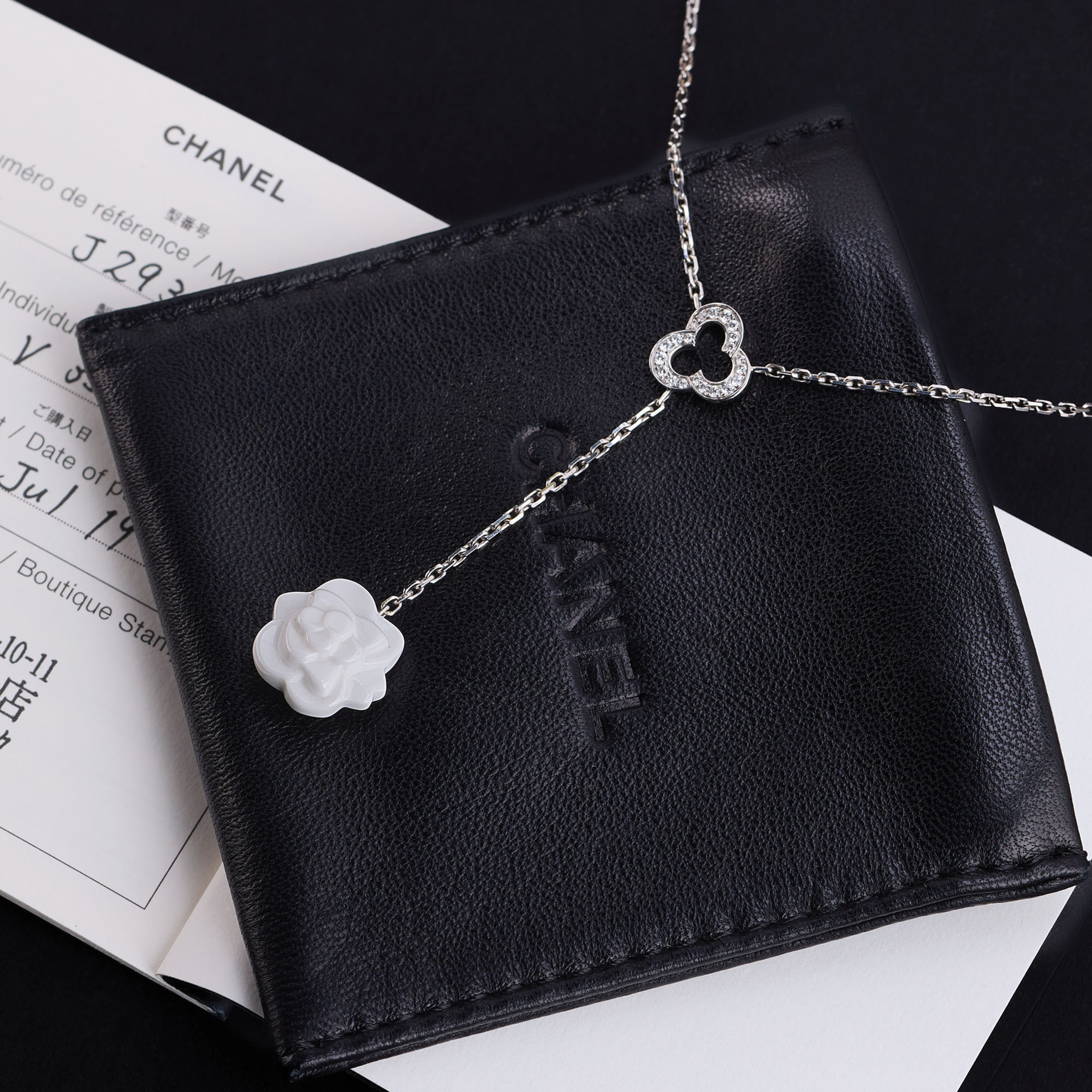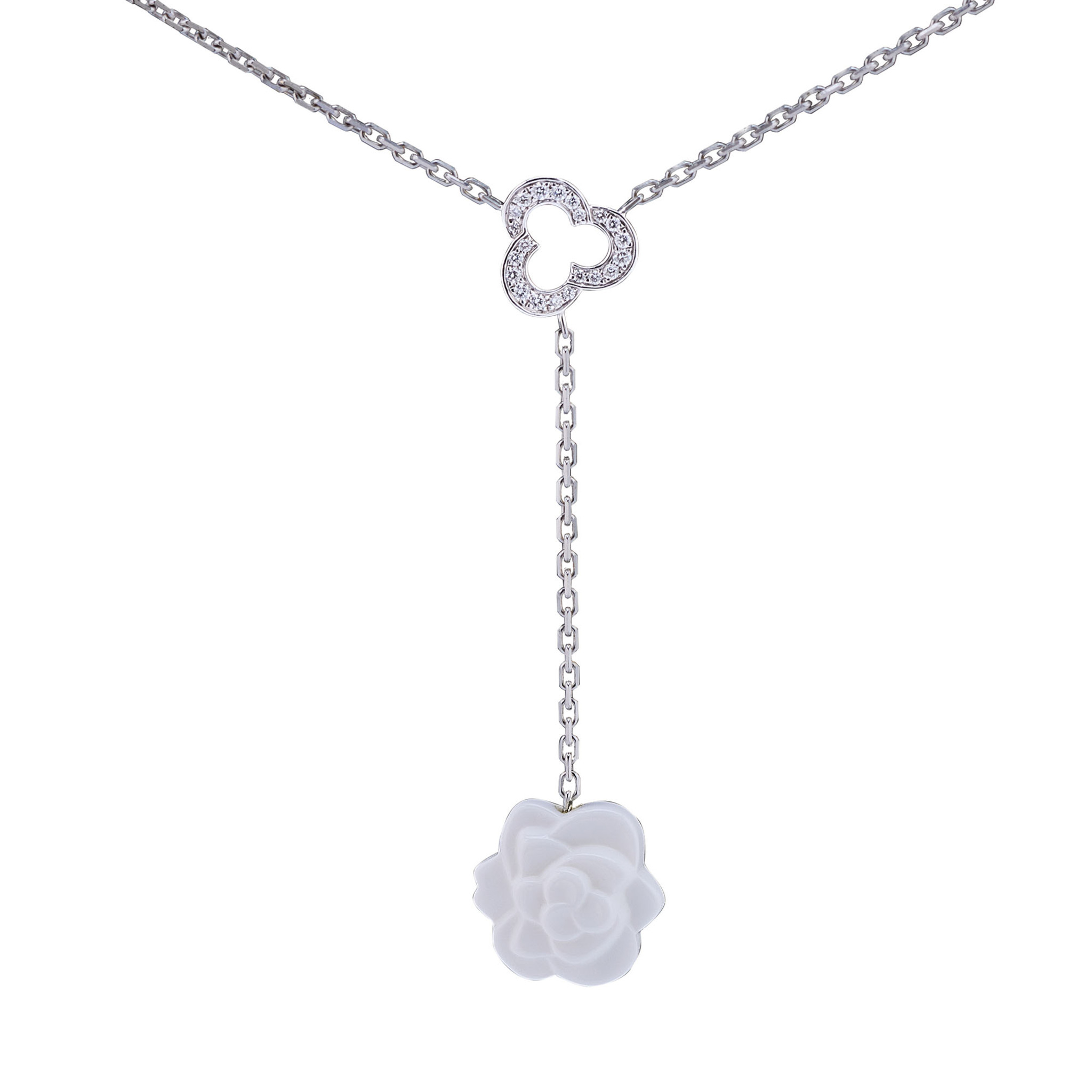 A rare and elegant, Chanel signed and numbered 18K white gold necklace with camellia agate pendant and diamond pendant
