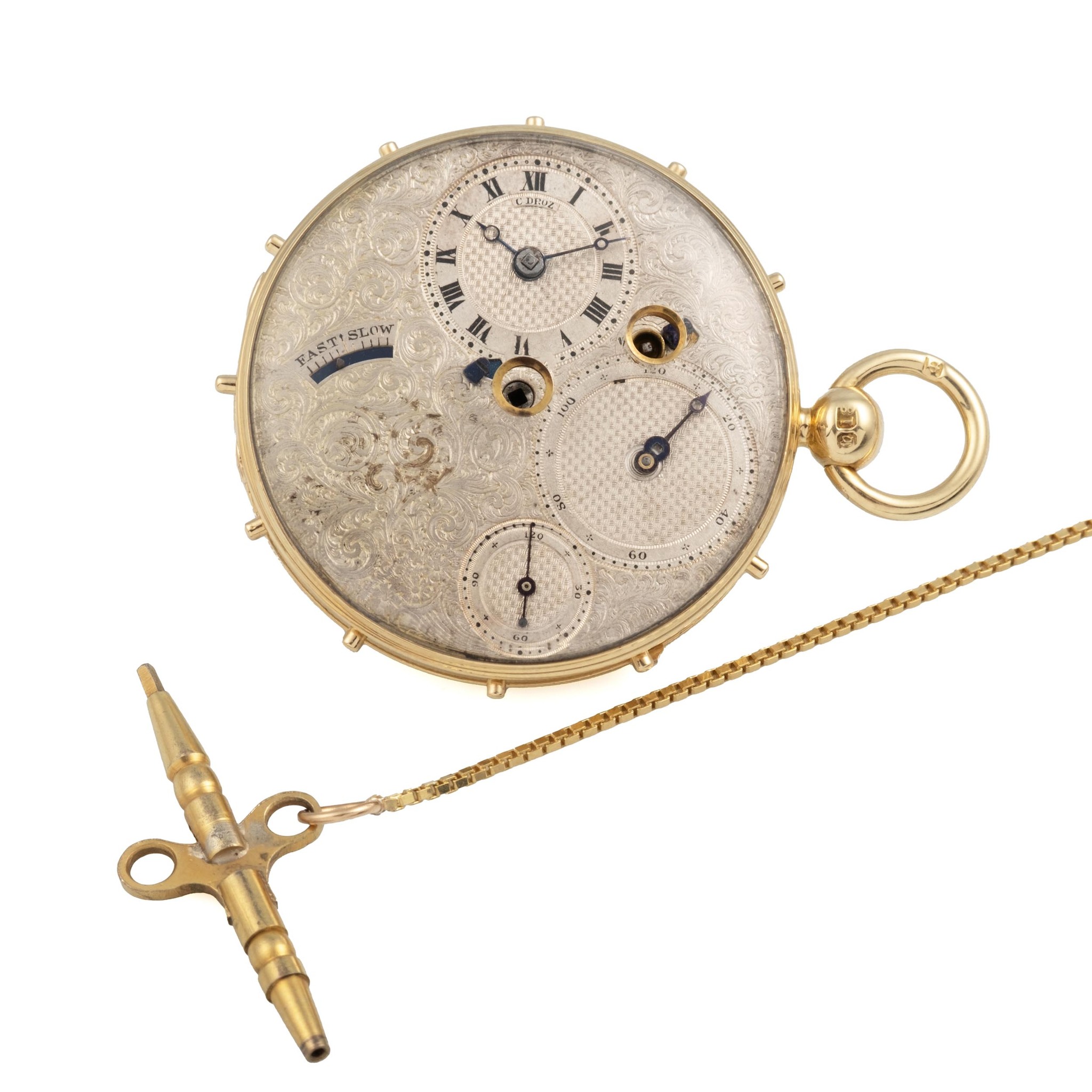 CHARLES DROZ, ENGLAND, SPECIAL ORDER '' MEDAILLON A TACT'' WITH A VERY UNUSUAL AUXILIARY DIAL DIVIDED UP TO 120 MINUTES AND AUXILIARY DIAL DIVIDED UP TO 120 SECONDS, 18K YELLOW GOLD