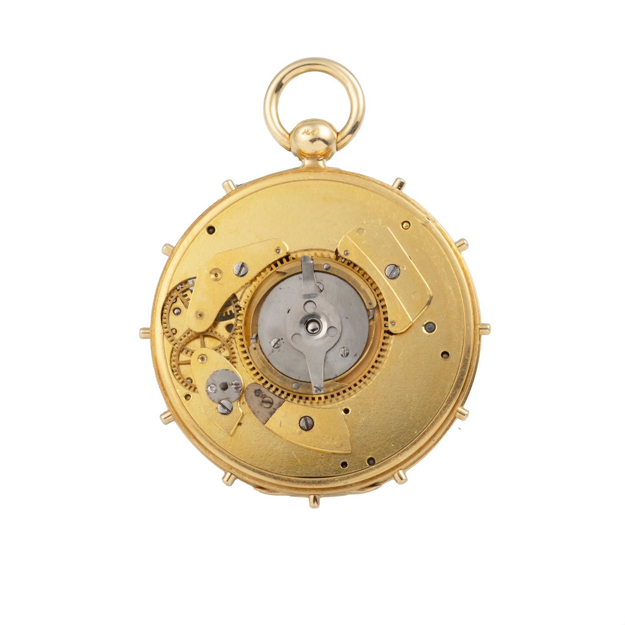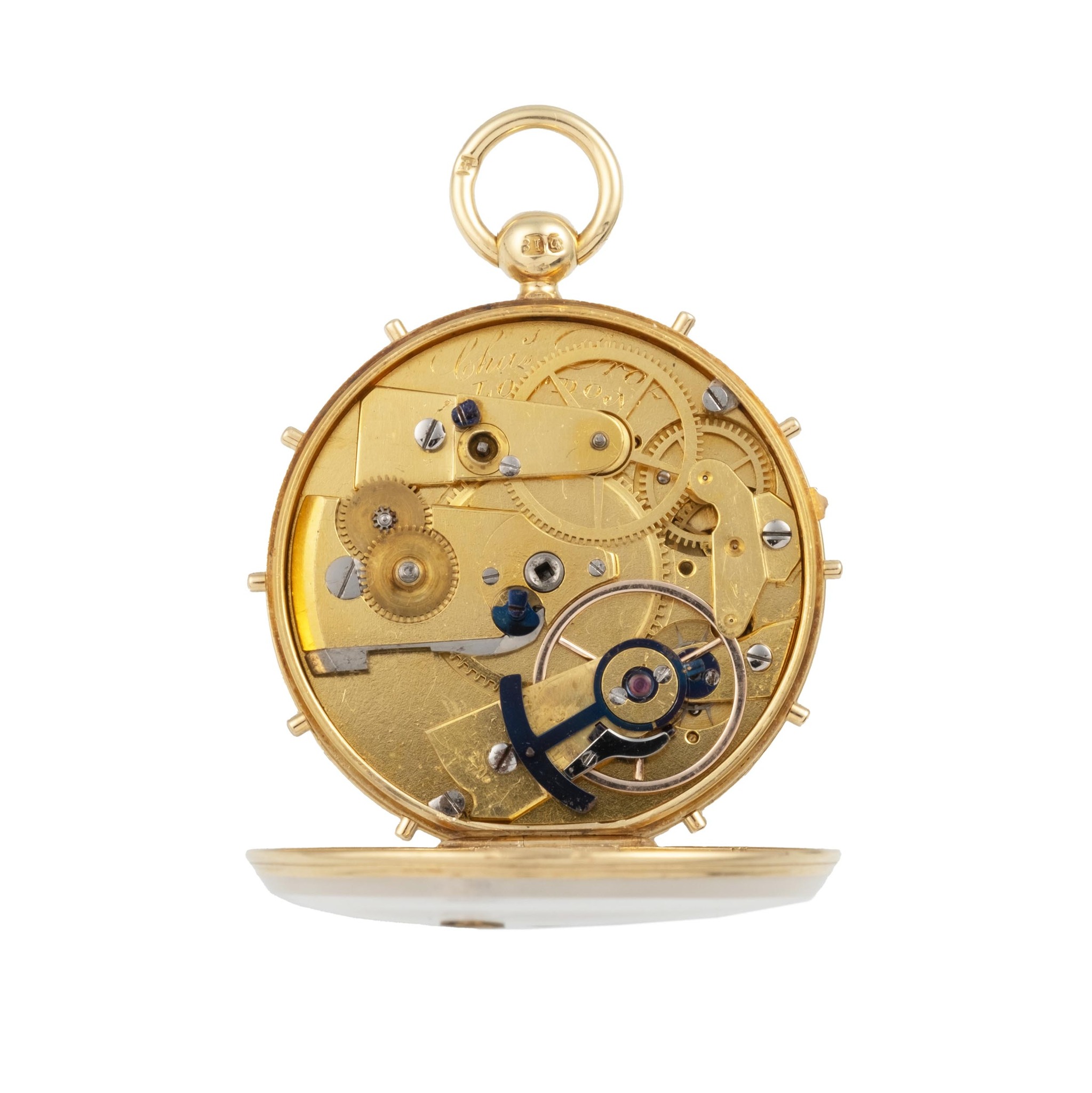 An extremely fine and probably unique, 18k gold, manual wind open-face, key-winding pocket watch. Exceptional silvered dial finely engine-turned and richly engraved with floral and rococo motifs. At 9 o’clock, an eccentric subsidiary dial for the hours and minutes with Roman numerals. At 1 o’clock, an eccentric subsidiary dial graduated for 120 minutes (two-hour counter). At 3 o’clock, an eccentric subsidiary dial graduated for 120 seconds. At 6 o’clock, a subsidiary s further features a “Fast/Slow” regulation aperture. Back cover featuring a single gold à tact hand, set in an engine-turned “à grains d’orge” case, with a gold pointer and inlaid blue enamel Roman numerals on the dial. The flat engine-turned band includes 12 hour markers (including the pendant) for the à tact function.