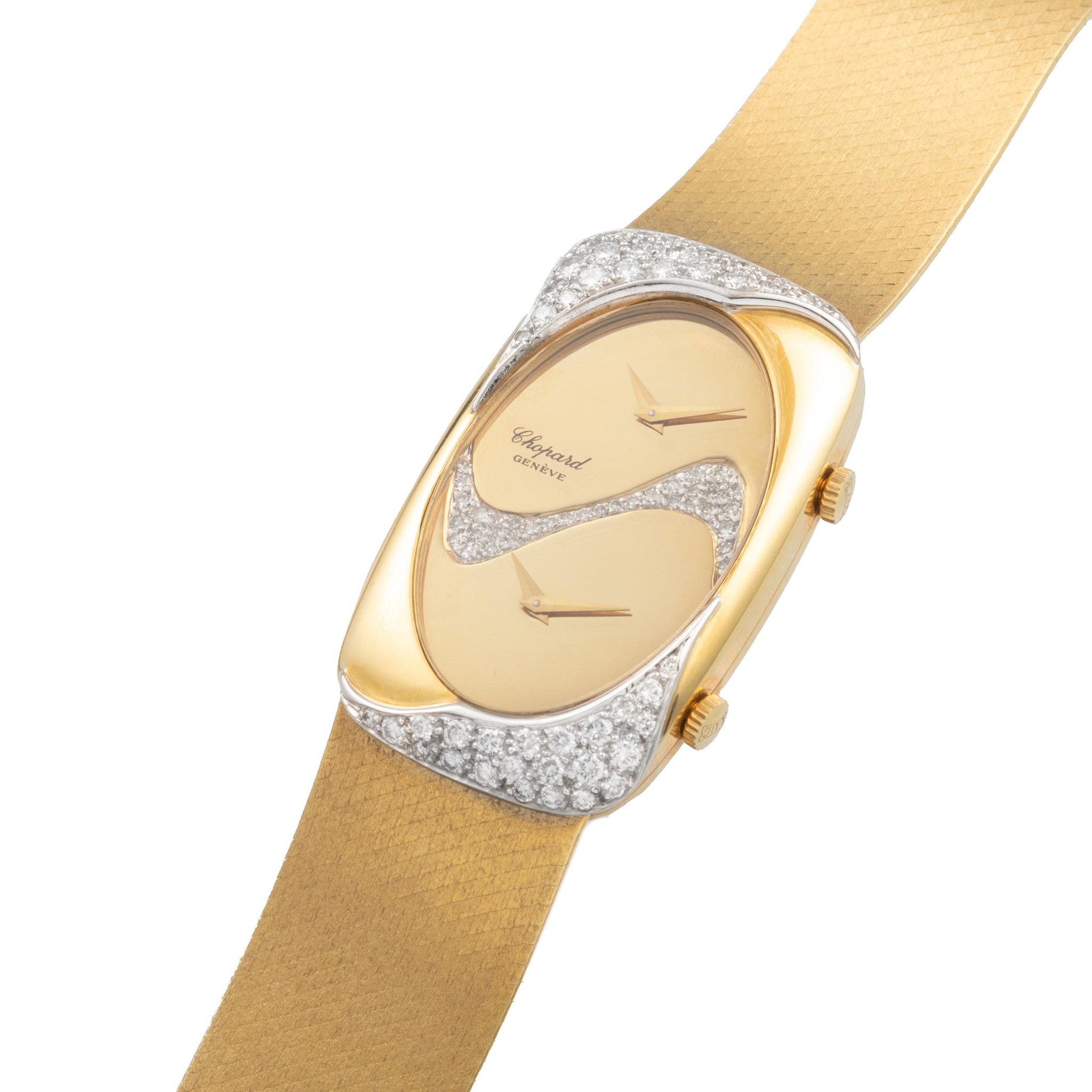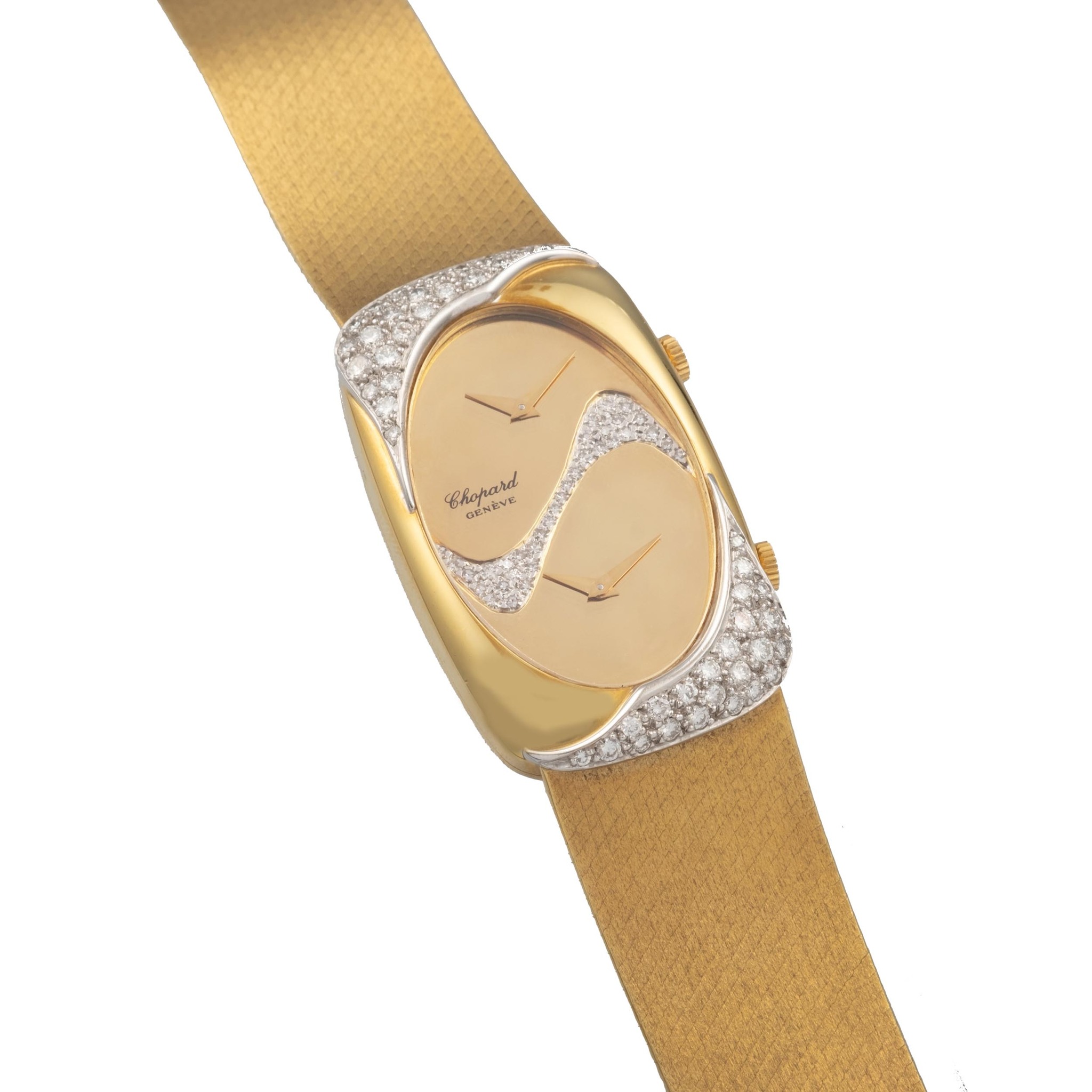A fine and very rare oversize 18k yellow and white gold manual winding wristwatch with 2 time zones and diamonds set. with 18k yellow gold chopard integrated "milanese" bracelet