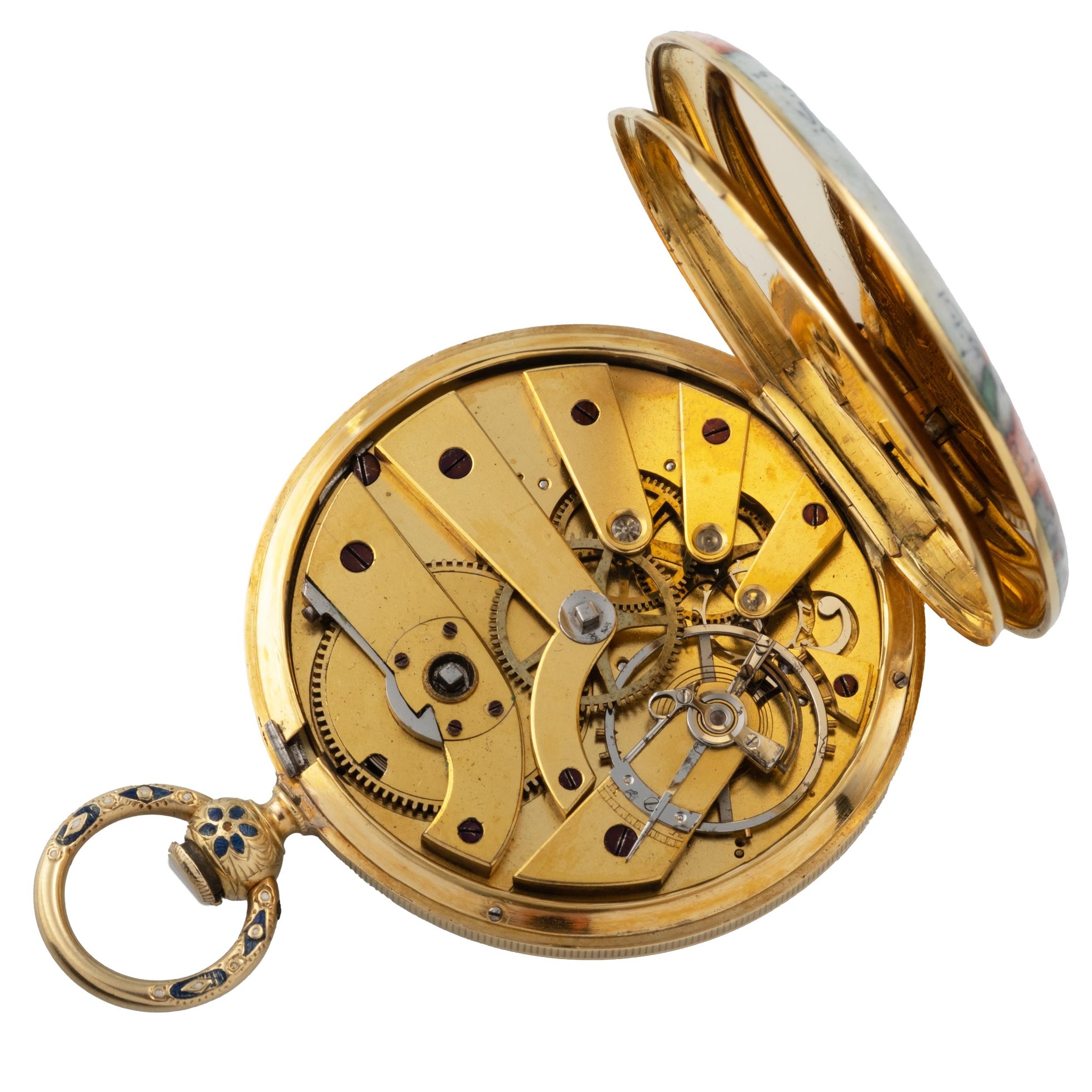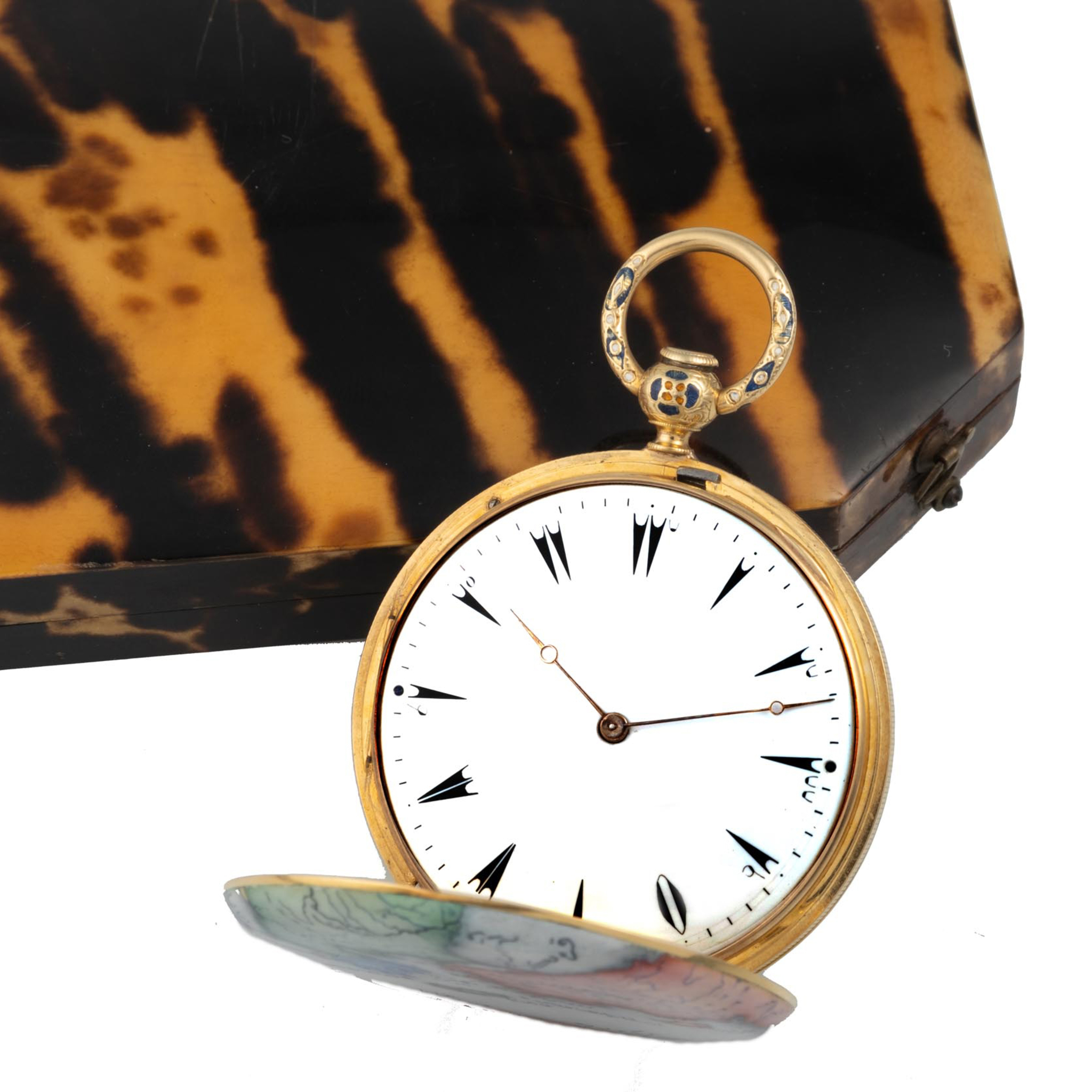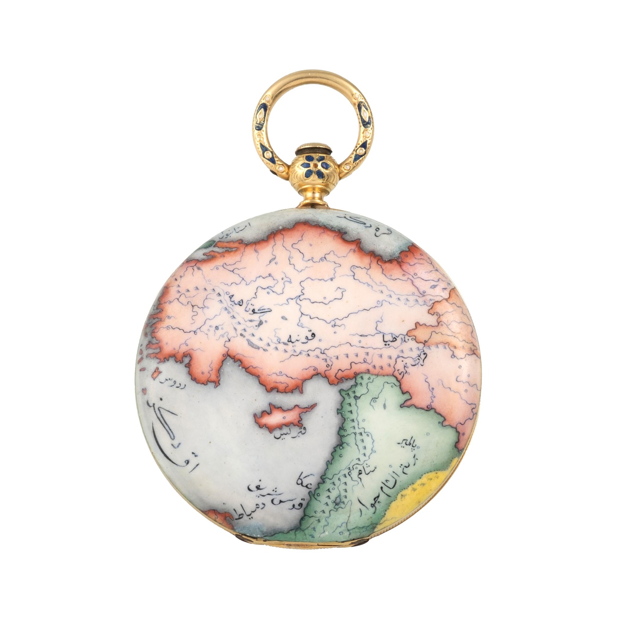 An extremely fine, important and unique, 18k yellow gold and enamel, manual wind hunting case, key winding pocket watch, entirely painted on enamel a map of the Ottoman Empire. White enamel dial with Turkish numrals, outer minute divisions. Breguet steel hands. Decorated on both sides with geographical maps of the Ottoman Empire, finely painted in translucent enamel (underglaze). • Side 1: Green representation of European Turkey, including Greece and the Balkans, with toponymy in the Ottoman Arabic alphabet. • Side 2: Red representation of Asian Turkey, including Anatolia and the Levant. These maps are remarkably precise, illustrating the relief, coasts, seas, and major cities, whose names are inscribed in Ottoman Turkish.
