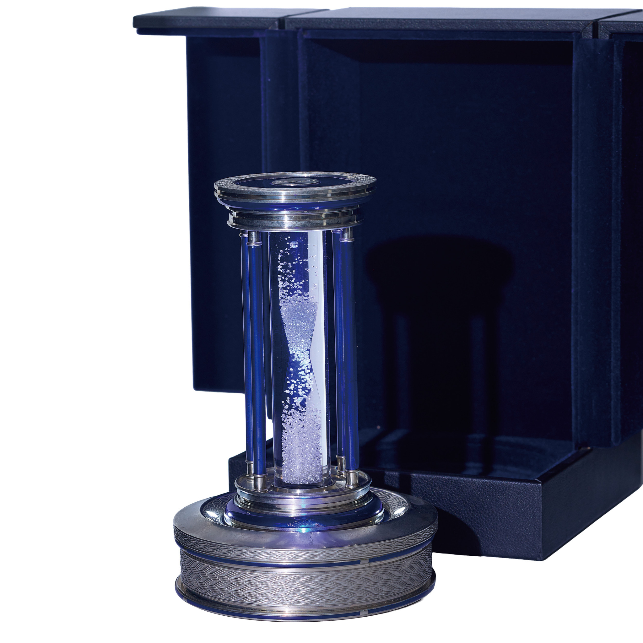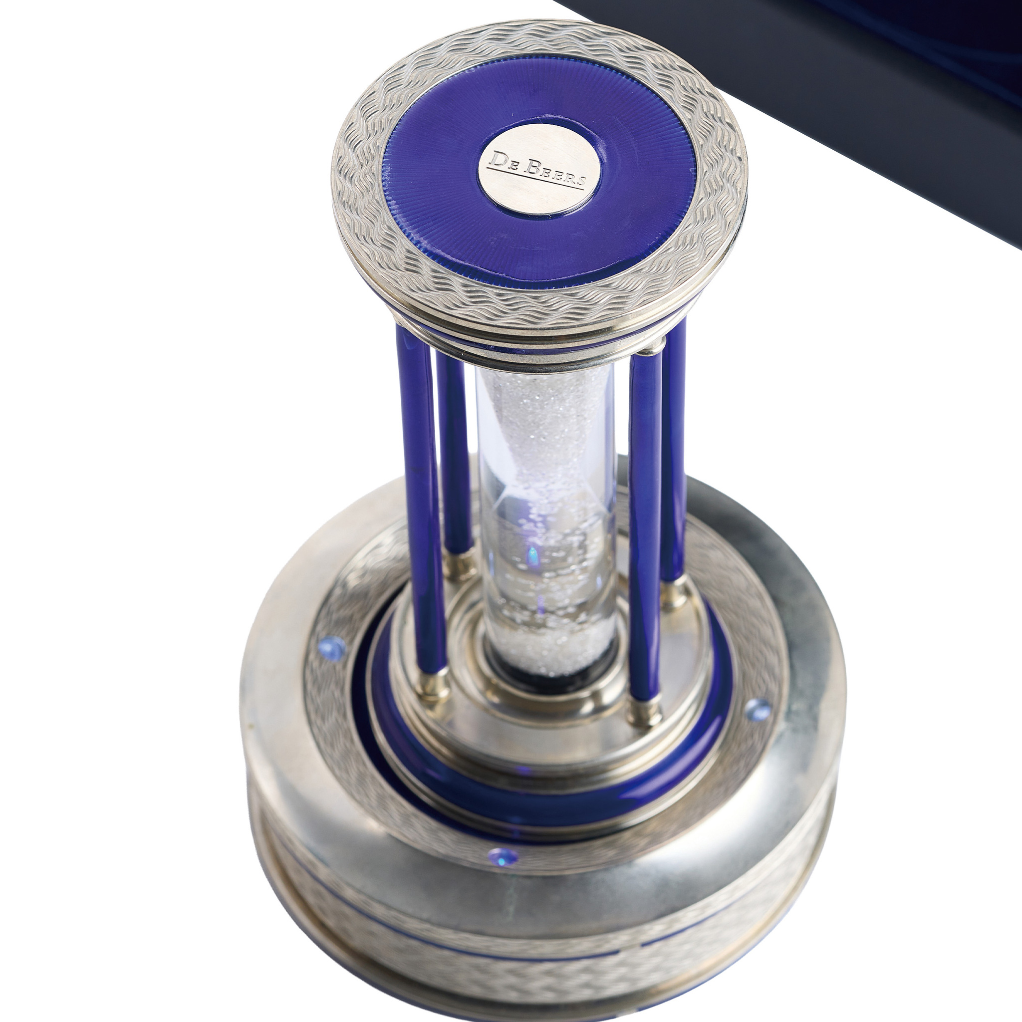 A very fine and elegant silver and blue enamel desk hourglass with over 2000 rough diamonds as the grains. Made in a limited edition of 500 pieces.
