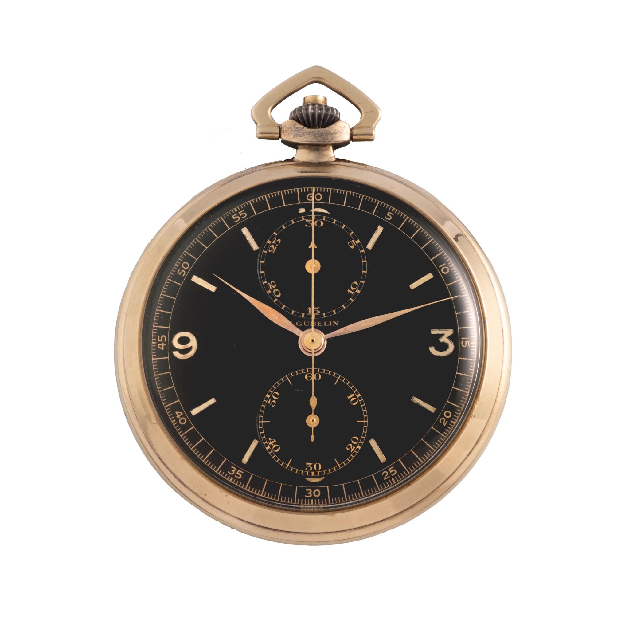 E.GÜBELIN, SWITZERLAND, SINGLE BUTTON CHRONOGRAPH, BLACK DIAL, 14K YELLOW GOLD