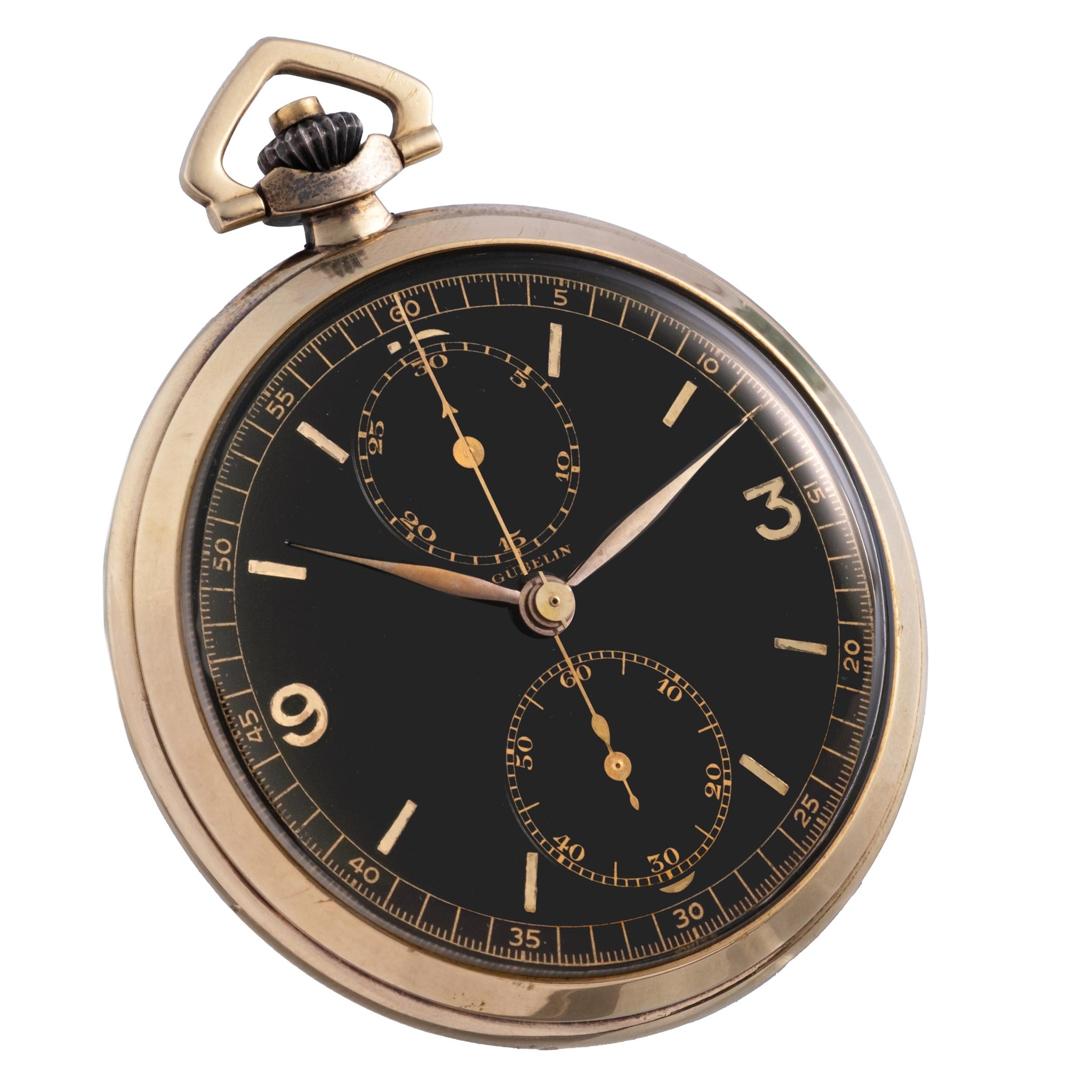 A very fine and rare, 18k gold, manual wind keyless open face pocket watch with single button chronograph, black dial.