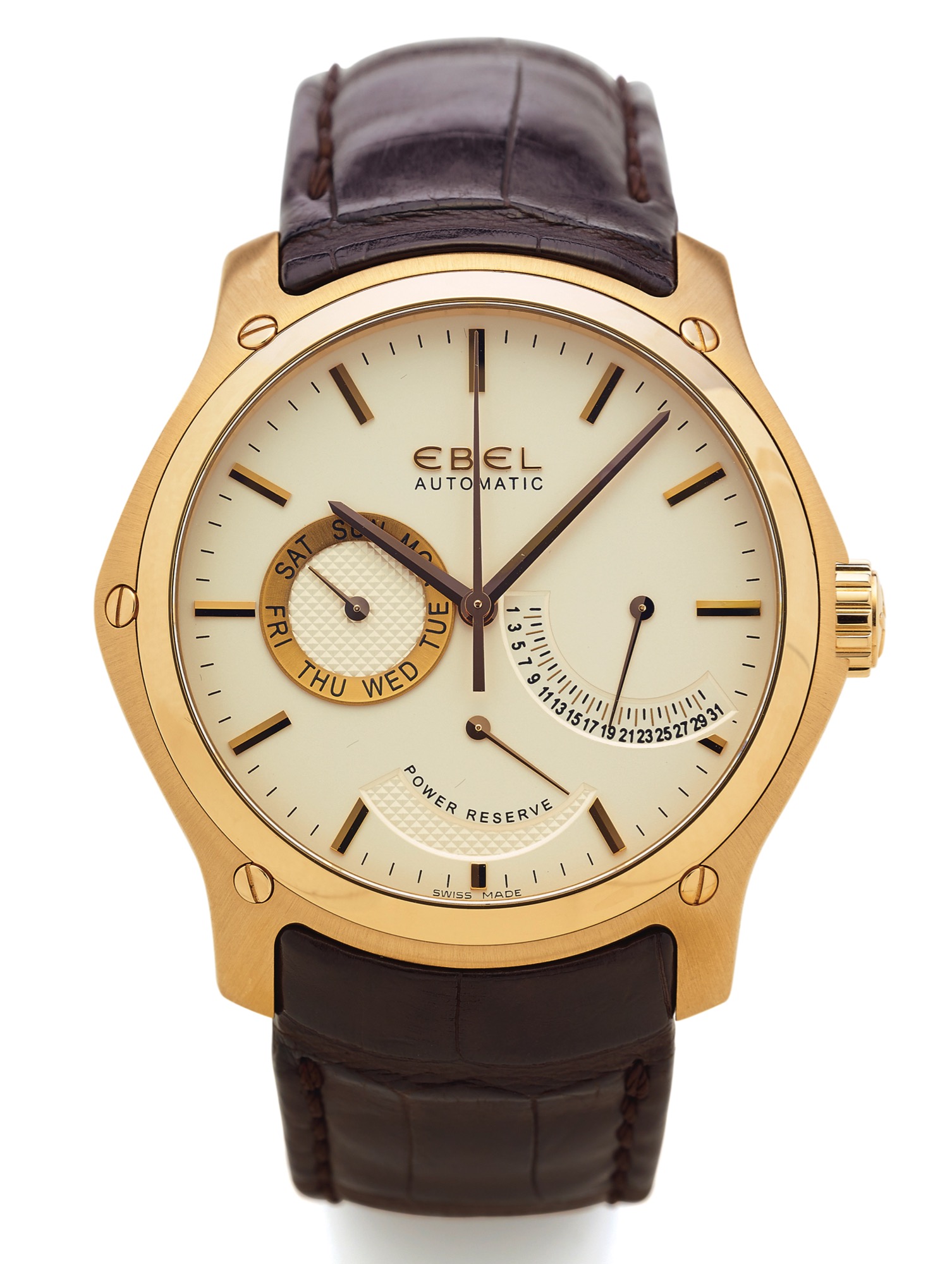 EBEL REF. A225014 DAY-DATE POWER RESERVE YELLOW GOLD Ebel, "Automatic, Day-date Power reserve" case No. 5303F61, Ref. A225014. Made circa 2000. Accompanied by the hang tag. Fine, hexagonal, self-winding, water-resistant, 18K yellow gold wristwatch with day-date, power reserve indication with an 18K yellow gold Ebel buckle.