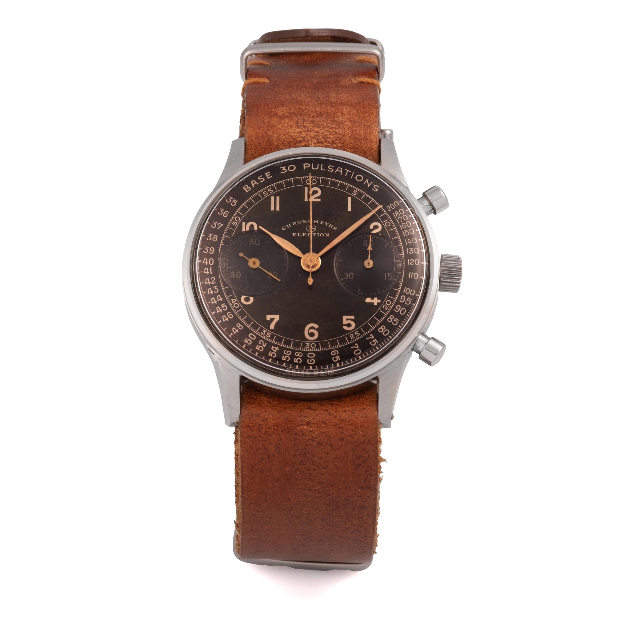 A fine, rare, large, stainless steel, manual wind chronograph wristwatch with tropical dial and pulsation scale.