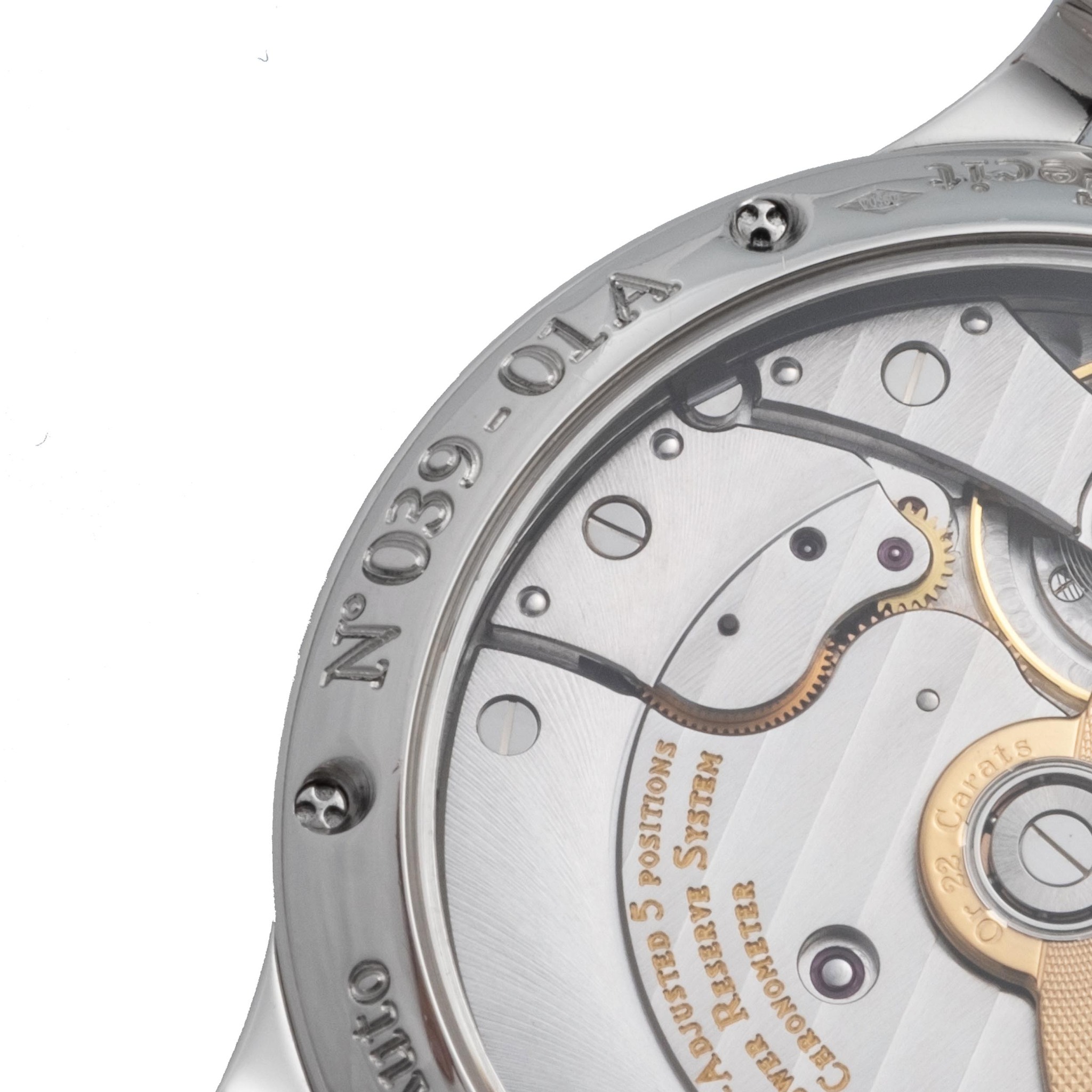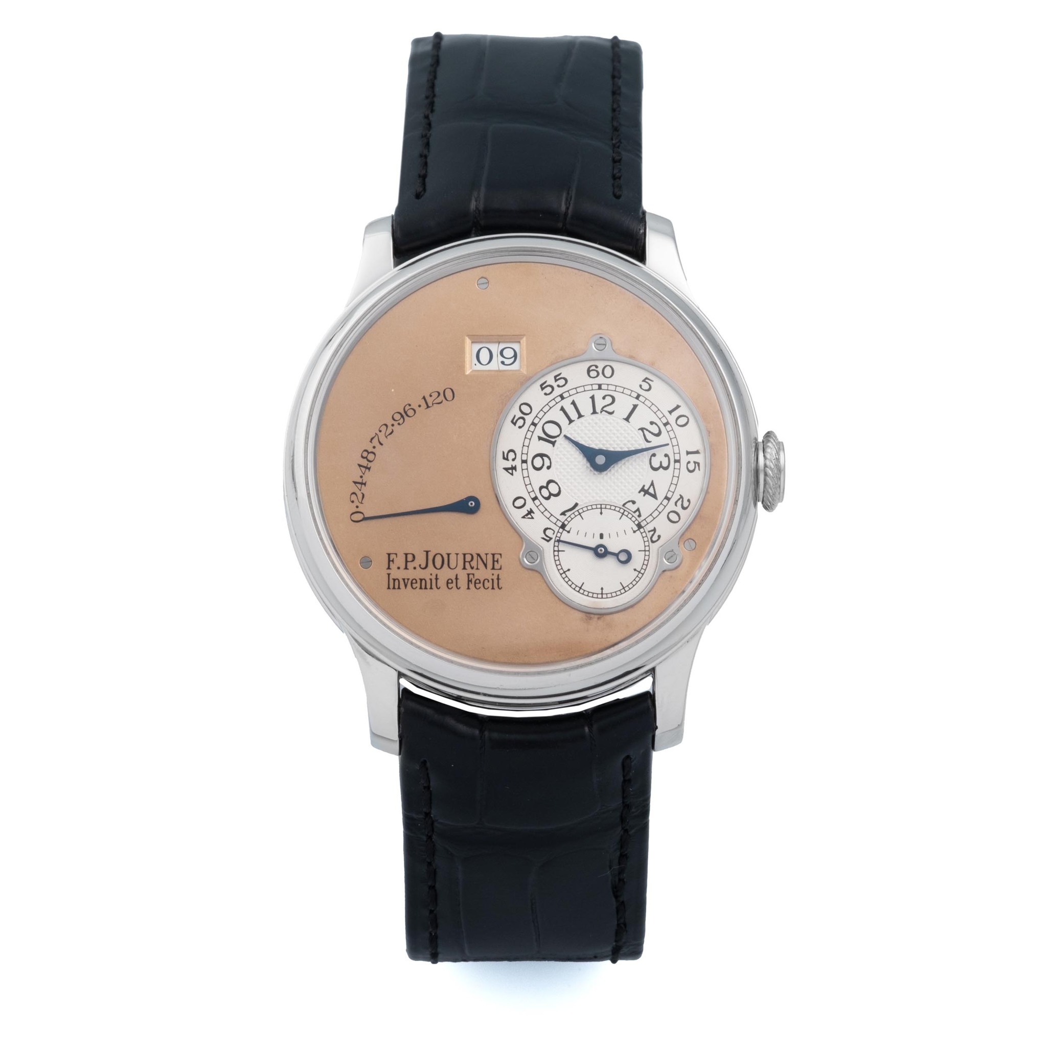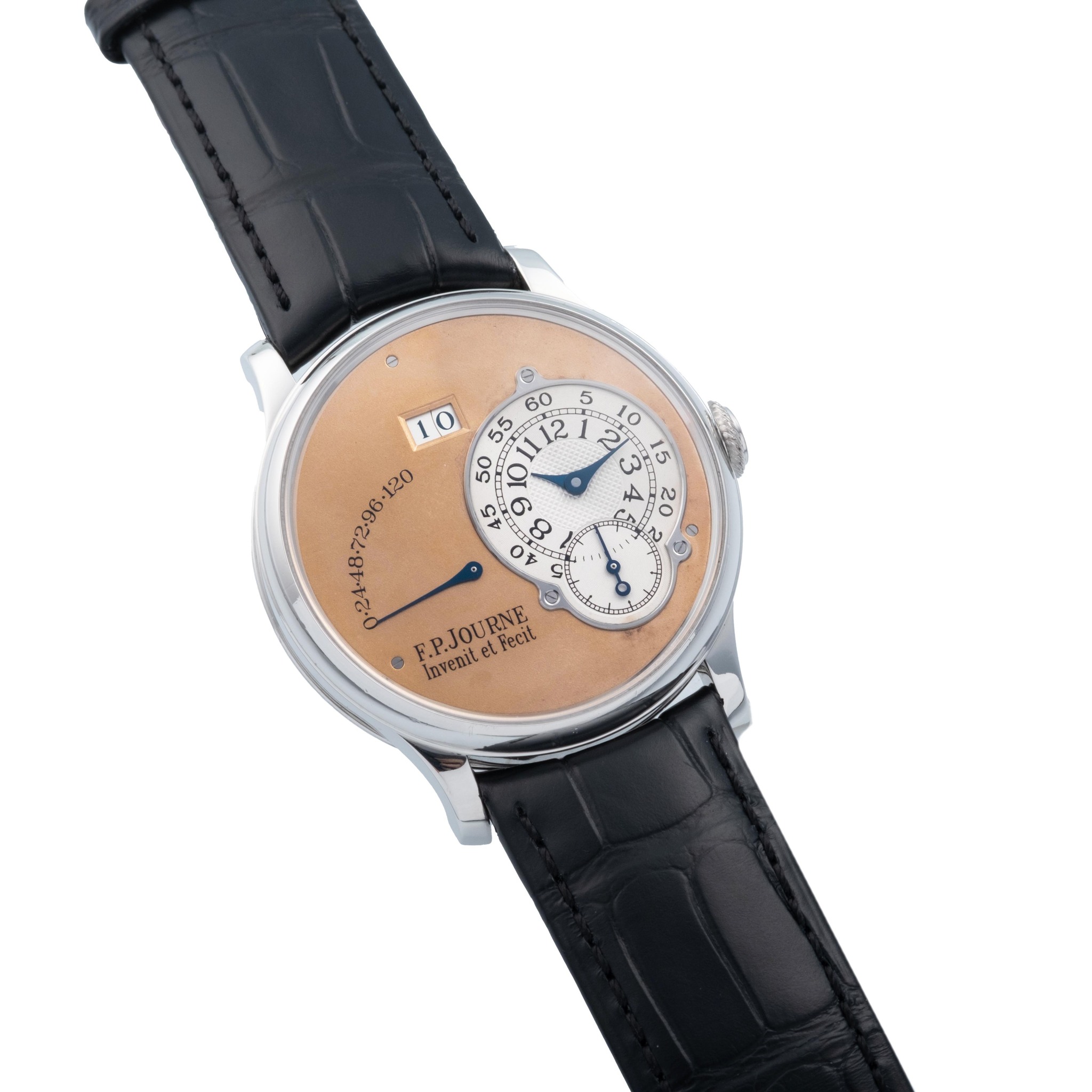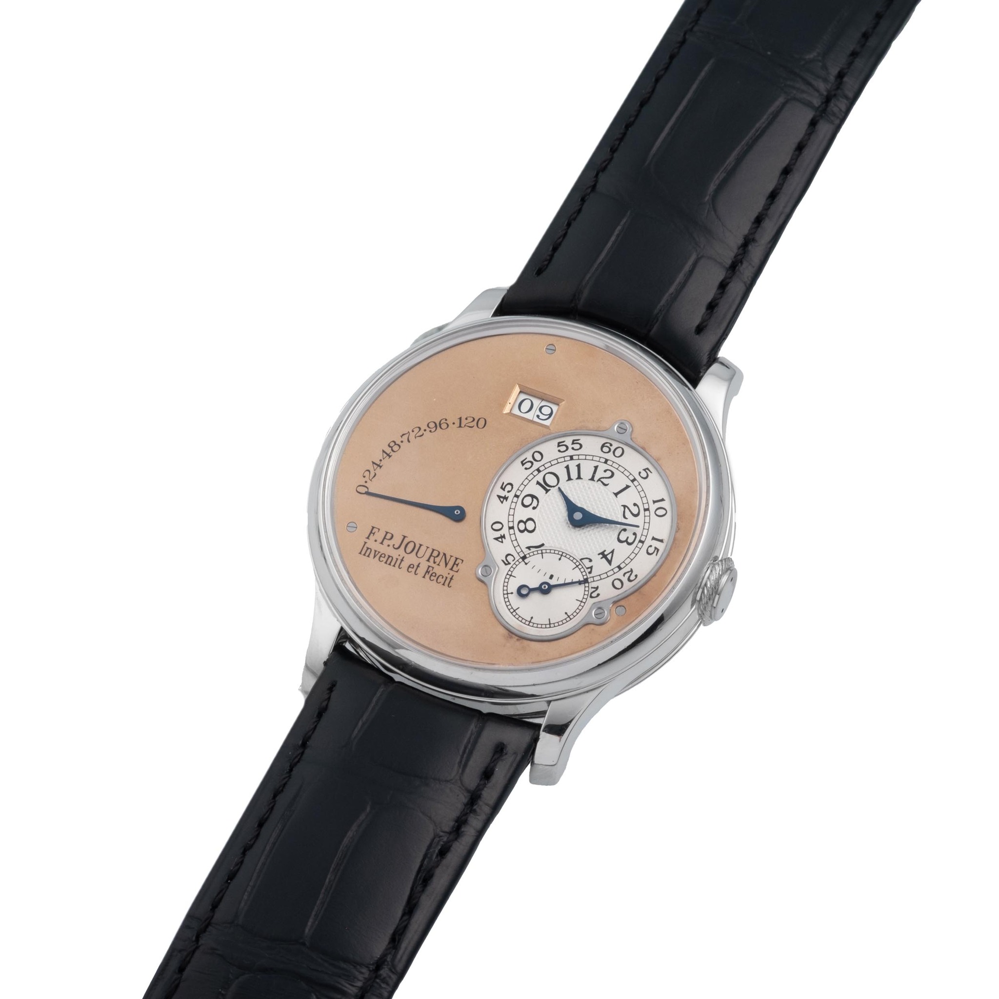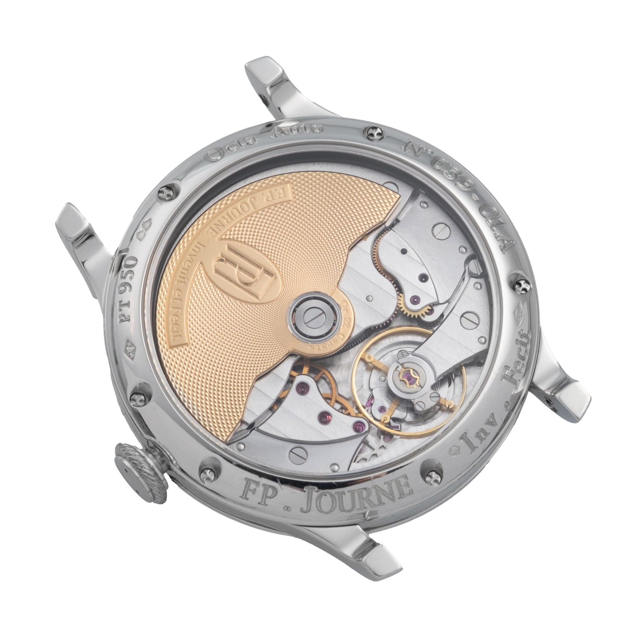 F.P. JOURNE, SWITZERLAND, OCTA RESERVE DE MARCHE, NO. 039, BRASS MOVEMENT WITH STRAIGHT GENEVA STRIPES, PLATINUM