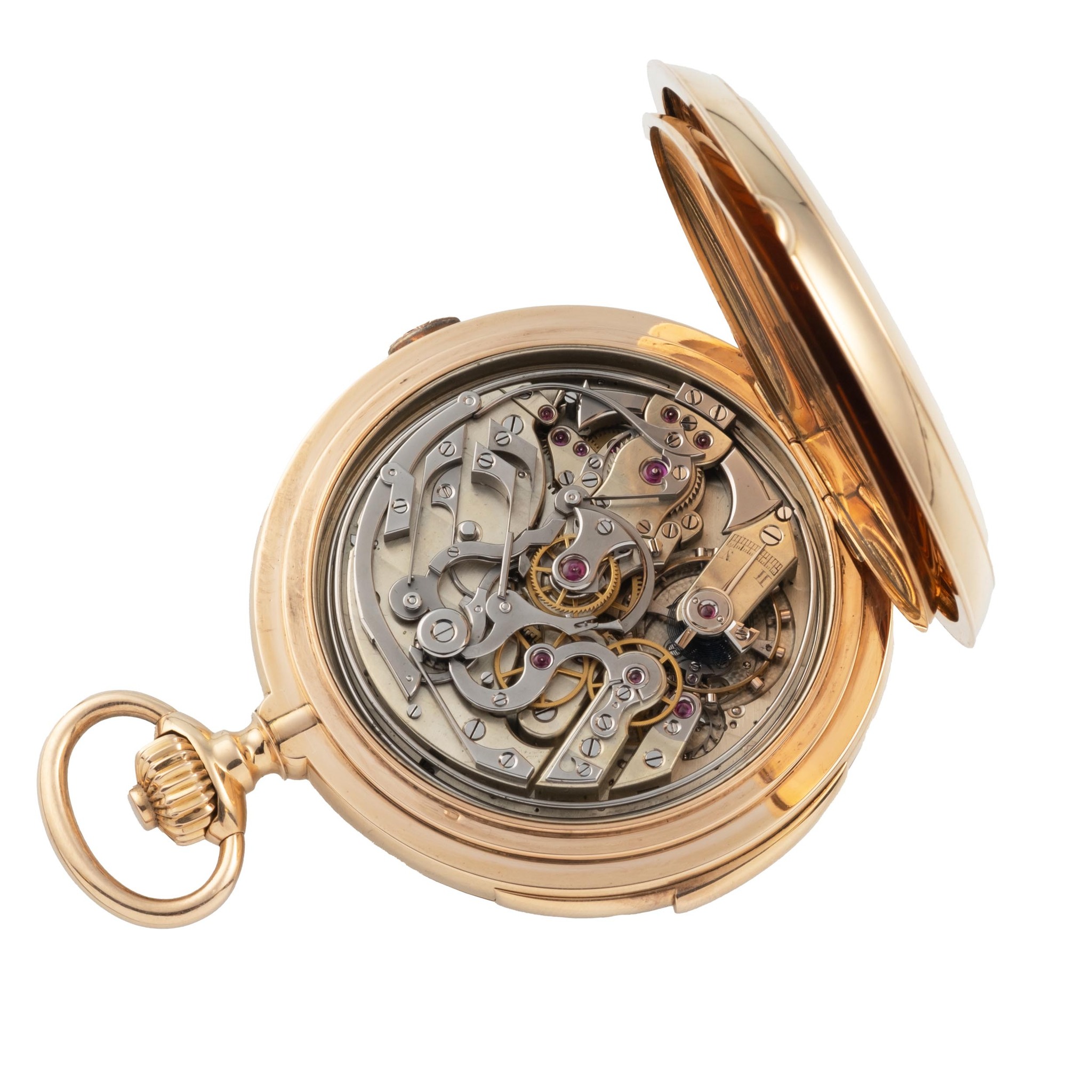 Caliber 46 mm., rhodium-plated, 35 jewels, counterpoised straight-line lever escapement, cut bimetallic compensation balance, blued steel Breguet balance spring with overcoil, swan-neck micrometric regulator, visible chronograph work, repeating on gongs activated by a slide on the band.