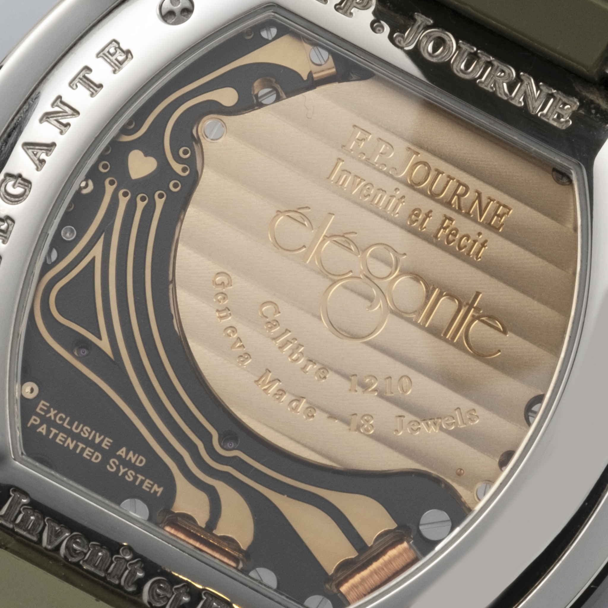 At the heart of the watch lies the calibre 1210, a highly advanced quartz movement conceived by François-Paul Journe to offer both precision and longevity. Activated by a motion-sensing system that places the movement into standby when unworn, it exemplifies the manufacture’s ability to transcend traditional categories and elevate quartz technology to a level of true horological ingenuity. The transparent caseback reveals the elegantly executed architecture of the calibre, underscoring the same attention to detail typically reserved for mechanical creations.