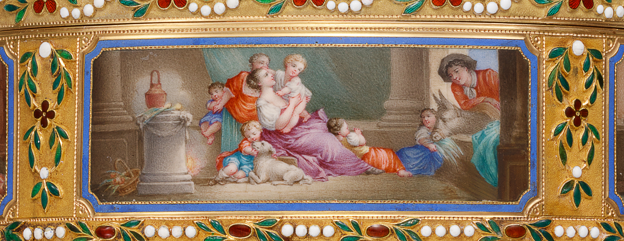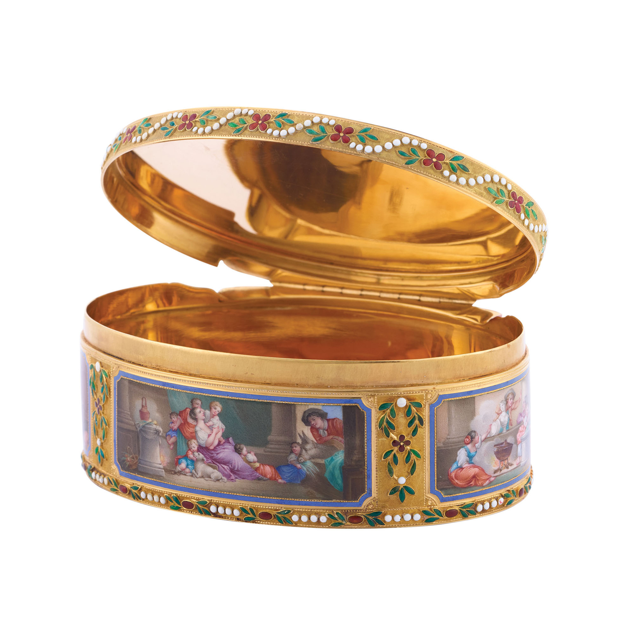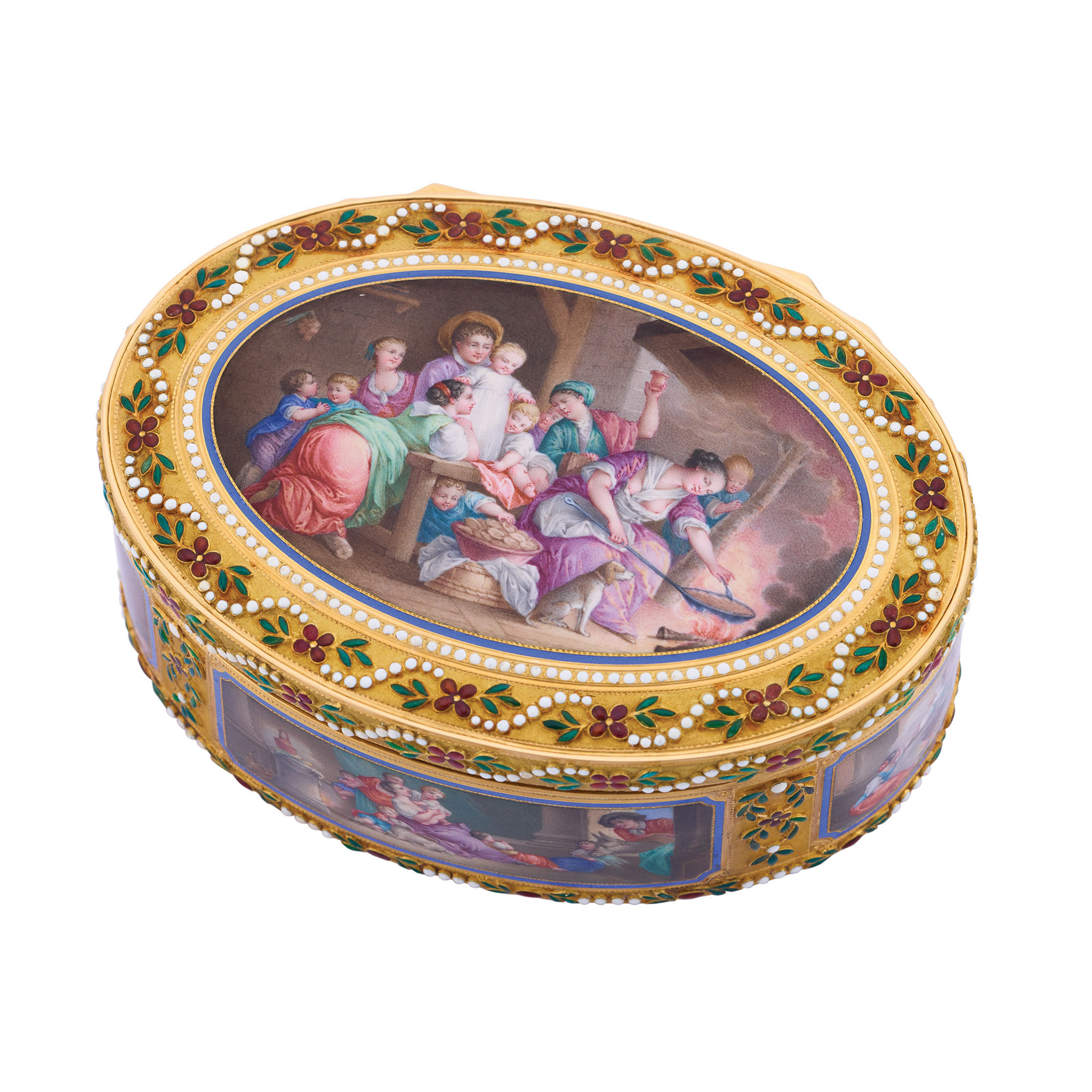 A This elegant oval-shaped snuff box is crafted from gold and enamel, featuring a hinged lid with matching decoration on the base and band. The lid, sides, and base panels are adorned with enamel paintings on gold, depicting intimate domestic genre scenes framed by a floral scroll enamel border. The central motif draws inspiration from a composition by Jean-Honoré Fragonard (1732–1806), including one of the side scenes titled «The Happy Family.» The remaining scenes appear to be artistic interpretations of other compositions. This snuff box, notable for its exquisite proportions, is preserved in an exceptional state.