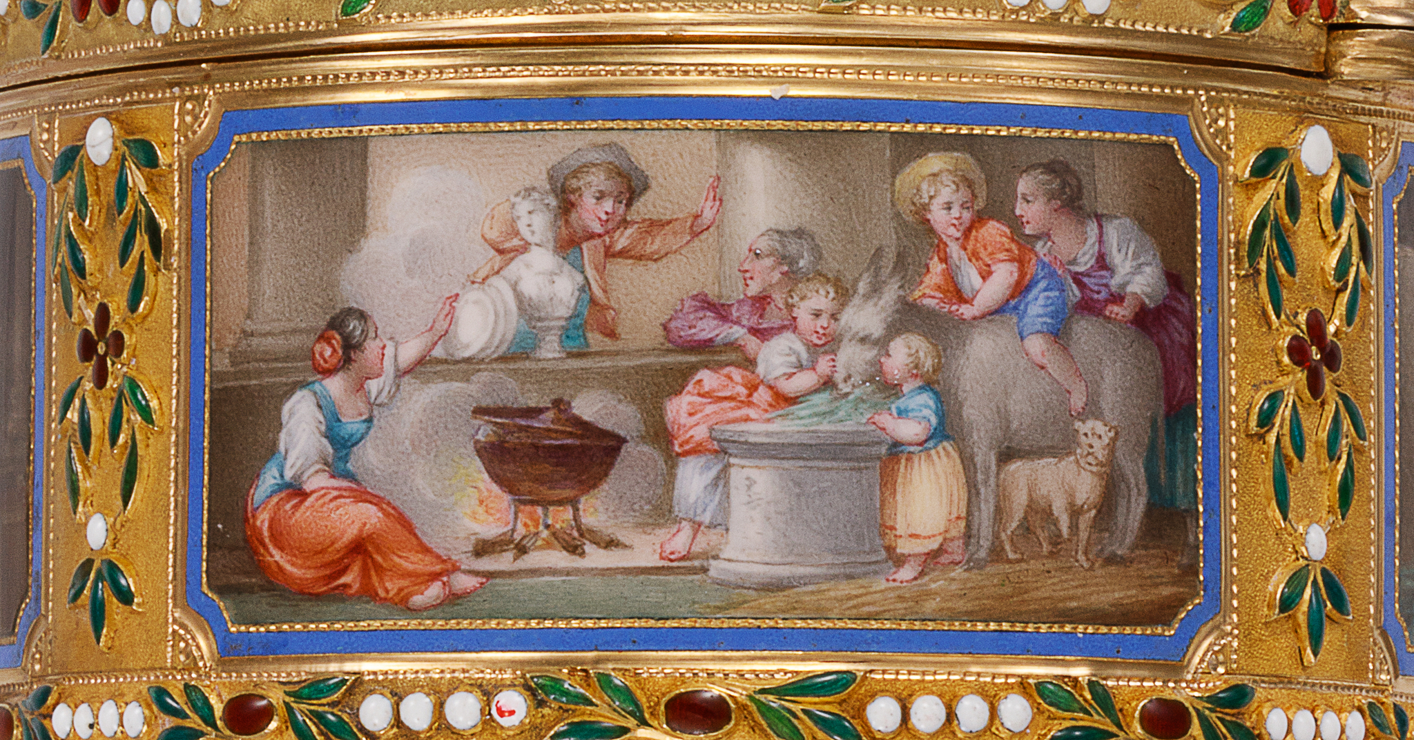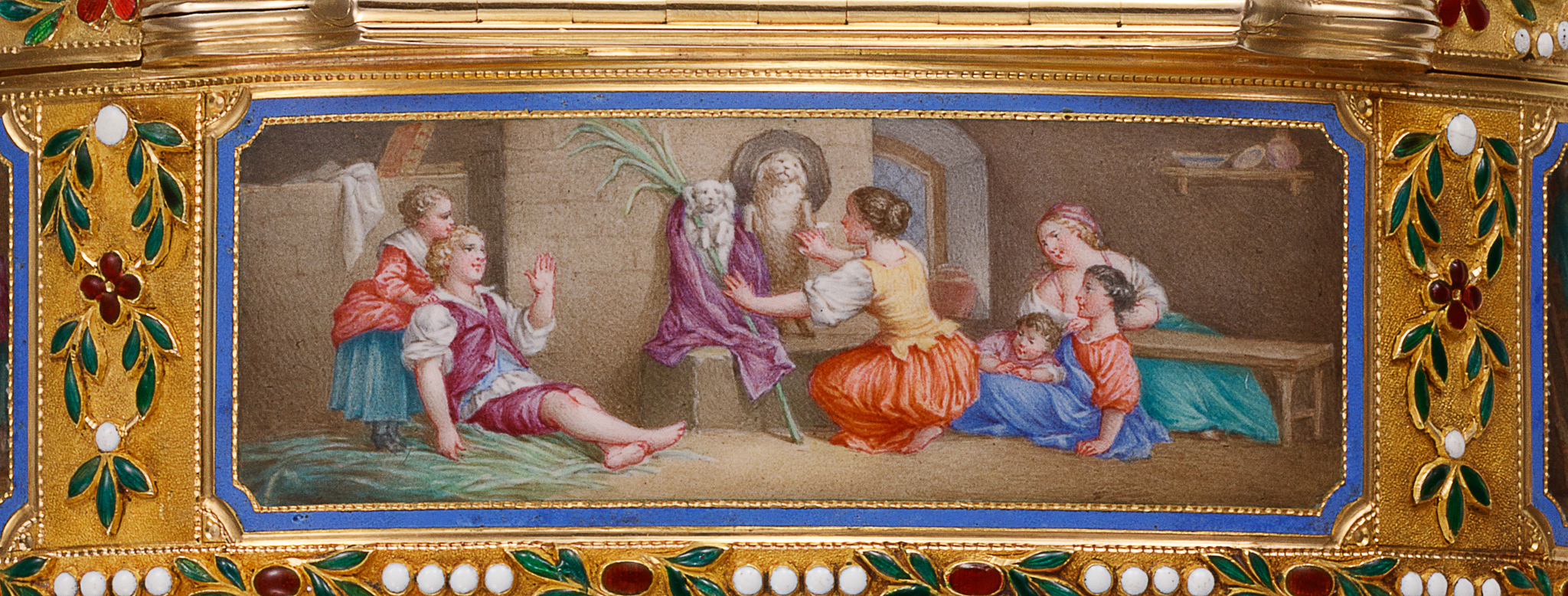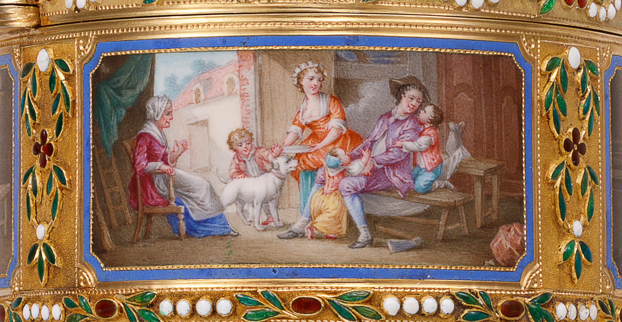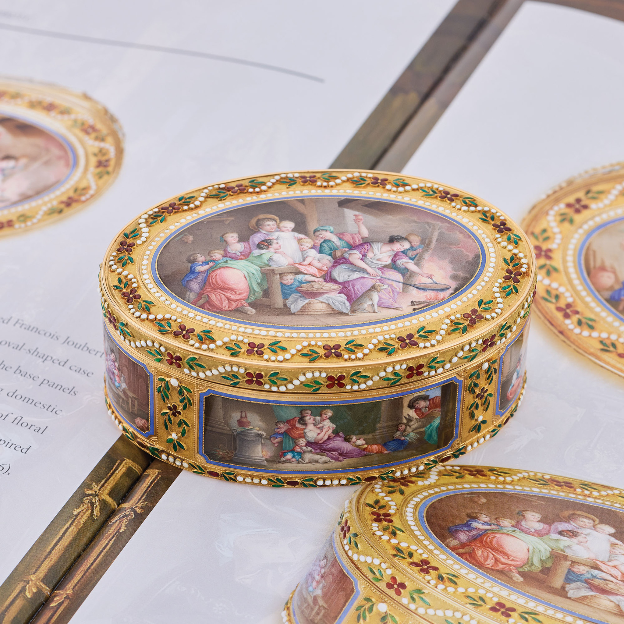 A This elegant oval-shaped snuff box is crafted from gold and enamel, featuring a hinged lid with matching decoration on the base and band. The lid, sides, and base panels are adorned with enamel paintings on gold, depicting intimate domestic genre scenes framed by a floral scroll enamel border. The central motif draws inspiration from a composition by Jean-Honoré Fragonard (1732–1806), including one of the side scenes titled «The Happy Family.» The remaining scenes appear to be artistic interpretations of other compositions. This snuff box, notable for its exquisite proportions, is preserved in an exceptional state.