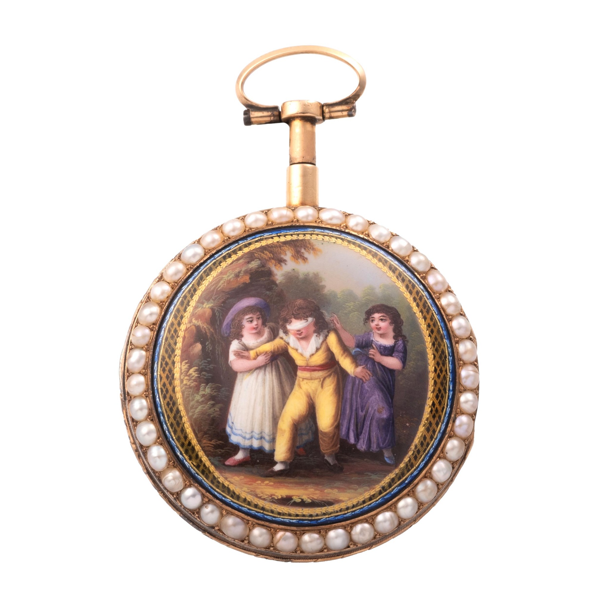 A fine 18k gold and enamel, pearl-set, manual wind open face, quarter repeater pocket watch. The back enamel panel depicting three young children playing blind man's bluff in a countryside.