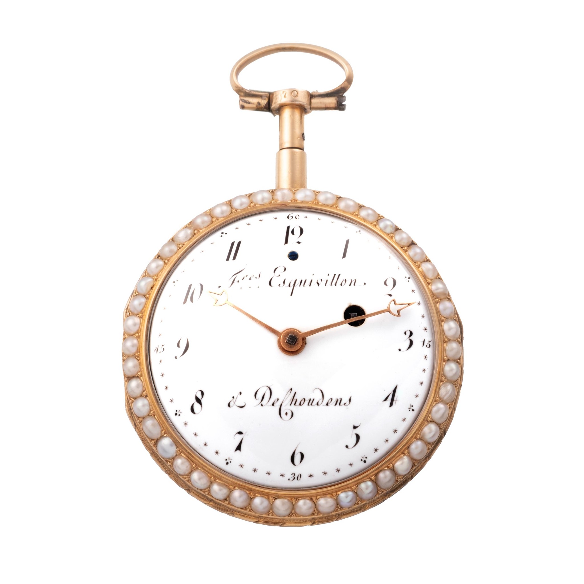 Caliber 35mm., hinged gilt brass full plate with cylindrical pillars, fusee with chain, verge escapement, plain brass three-arm balance, flat balance spring, gilt brass continental cock with polished steel end-piece. Repeating on a bell by depressing the pendant.