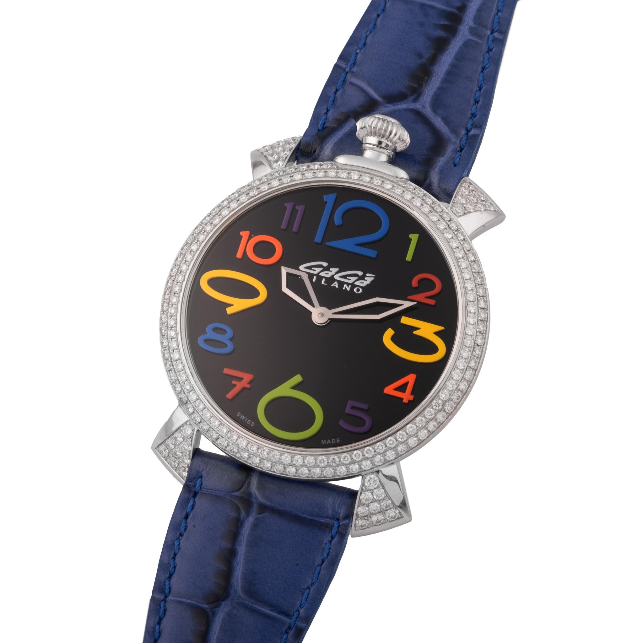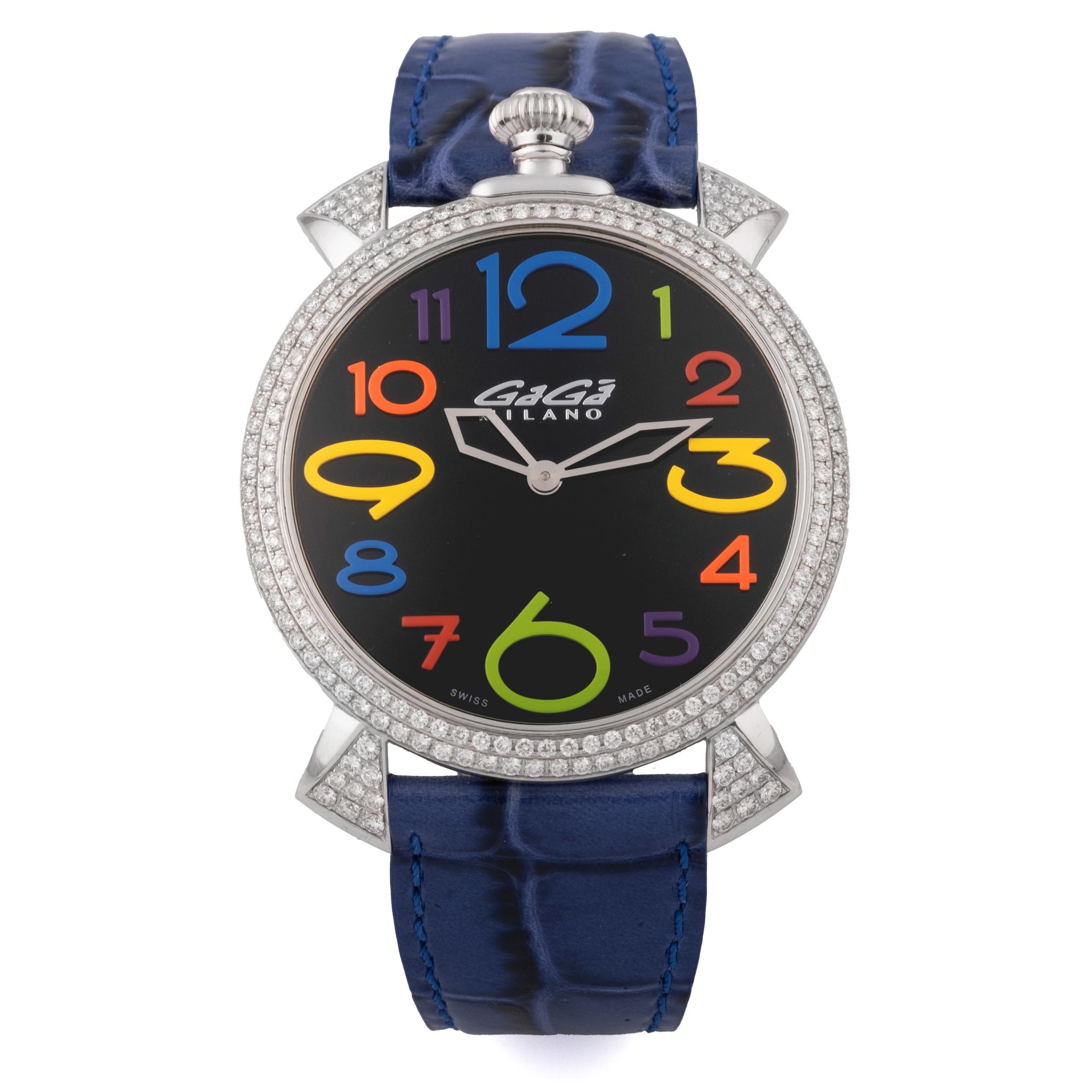 A rare and striking creation, this diamond-set Manuale Thin reflects Gaga Milano’s artistic spirit, a watch that transforms time into an expression of color, luxury, and personality.