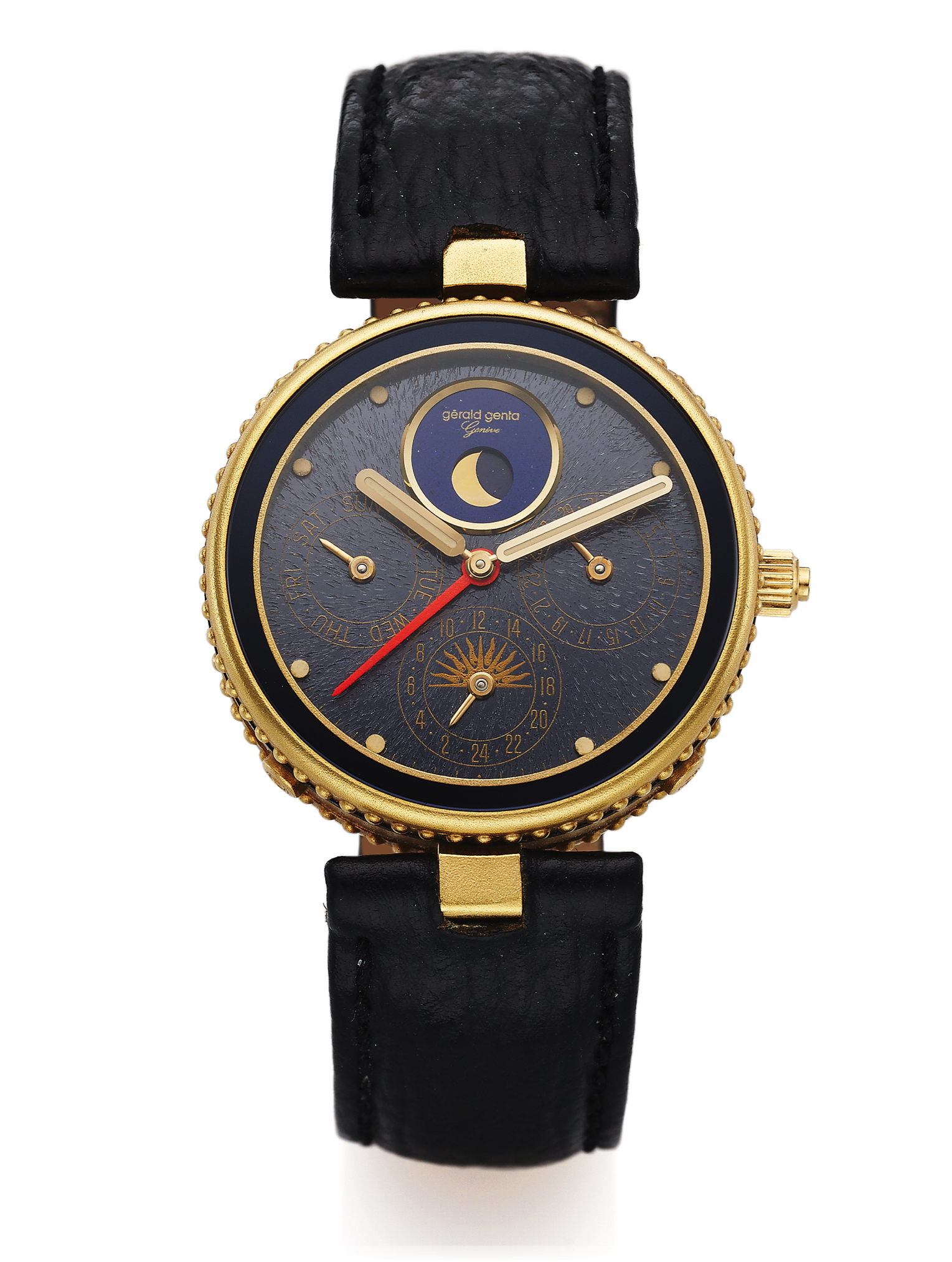 GERALD GENTA REF. G2796.4 GEFICA YELLOW GOLD Gérald Genta "Gefica," case No. 35523, Ref. G 2796.4. Made in the 1980s. Fine, astronomic, two time zone, water-resistant, yellow gold and black onyx quartz wristwatch with day and date, moon phases, 24-hour indication and an 18K yellow gold Gerald Genta double deployant clasp.