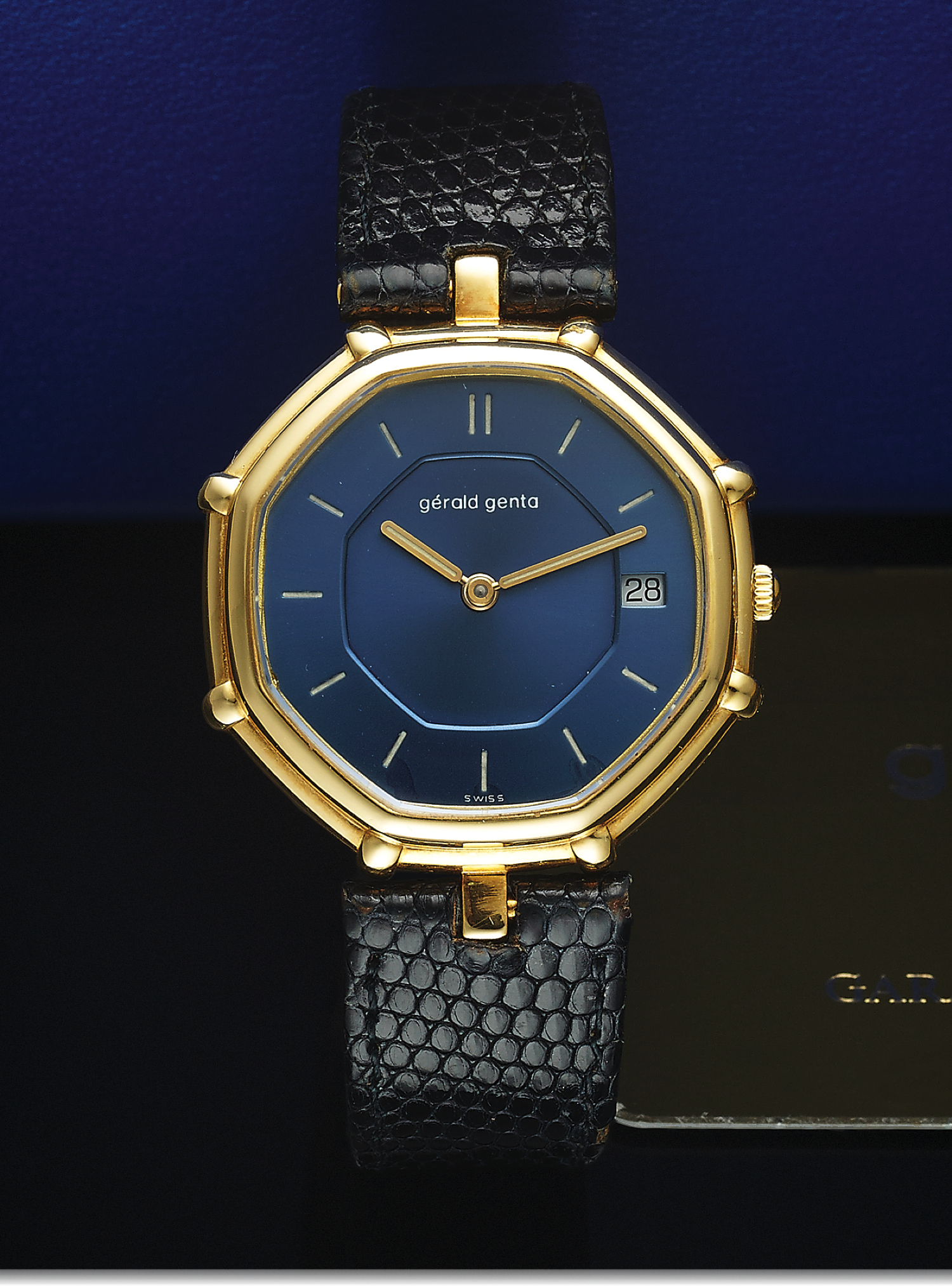 GERALD GENTA REF. G.3286.7. YELLOW GOLD Gérald Genta, Genève, case No. 49026, Ref. G 3286.7. Made in the 1990s. Fine, octagonal, self-winding, water-resistant, 18K yellow gold wristwatch with date and an 18K yellow gold Gerald Genta buckle. Accompanied by a fitted box and service guarantee dated 04/2004.