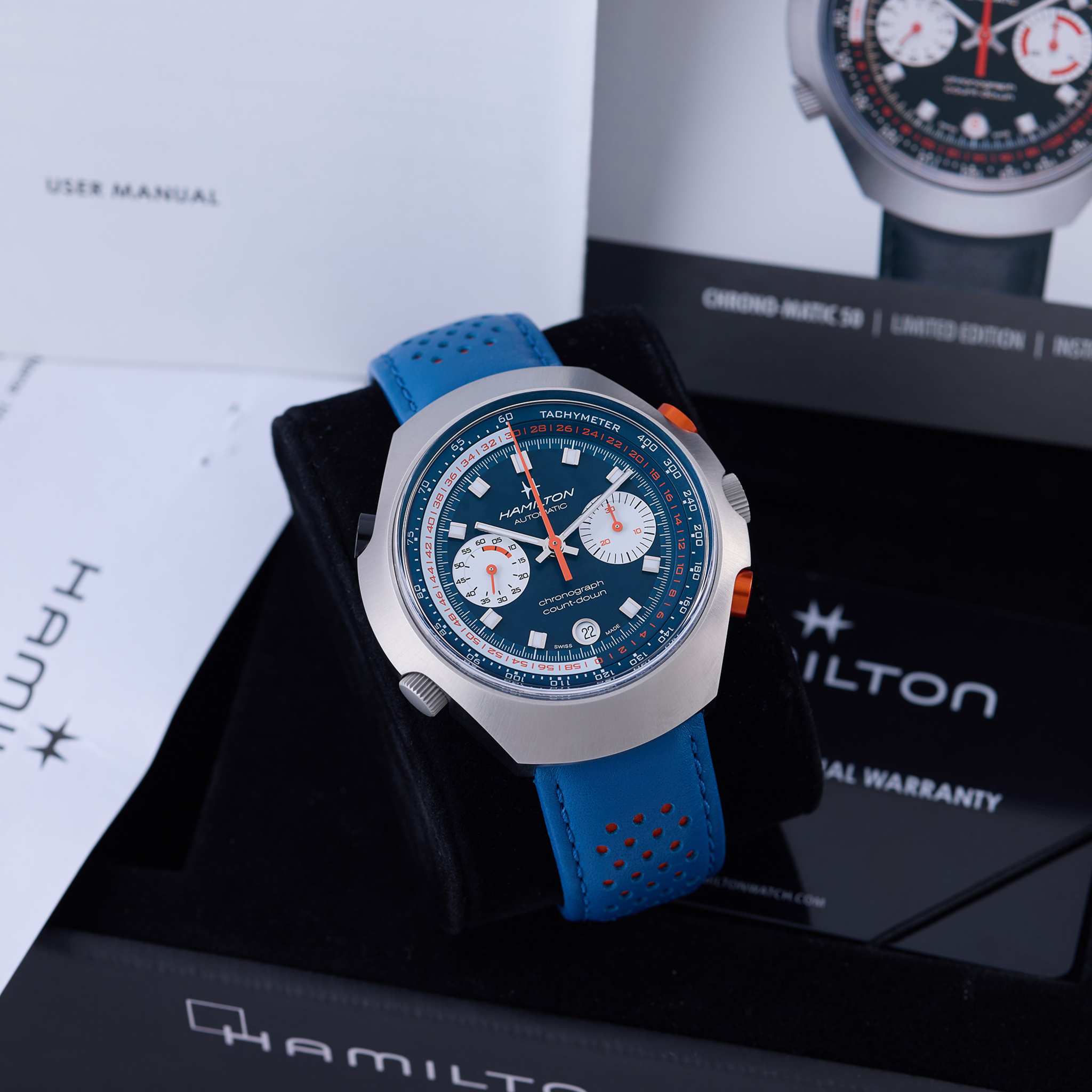 Accessories Hamilton fitted box, copy of the original sale invoice, booklets, warranty card dated Feb 2025