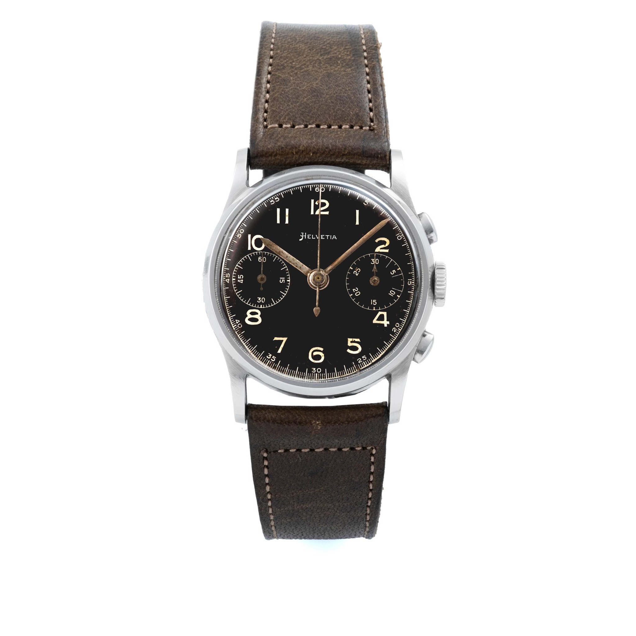 A fine, stainless steel, manual wind chronograph wristwatch with black dial
