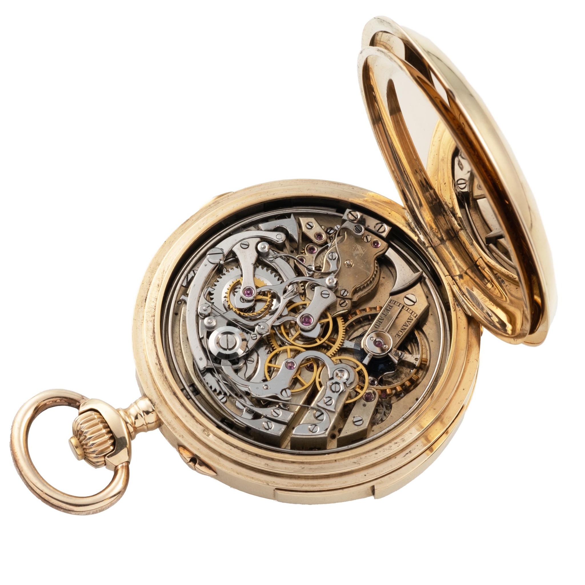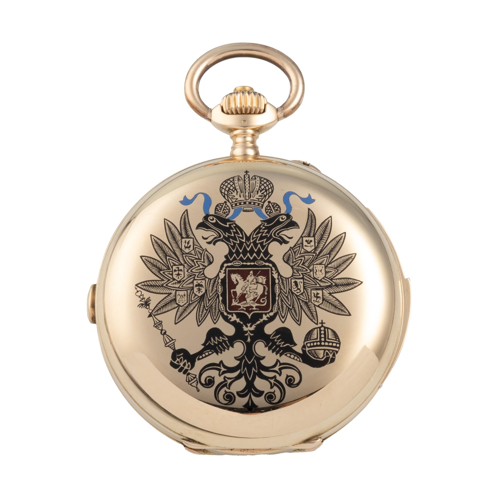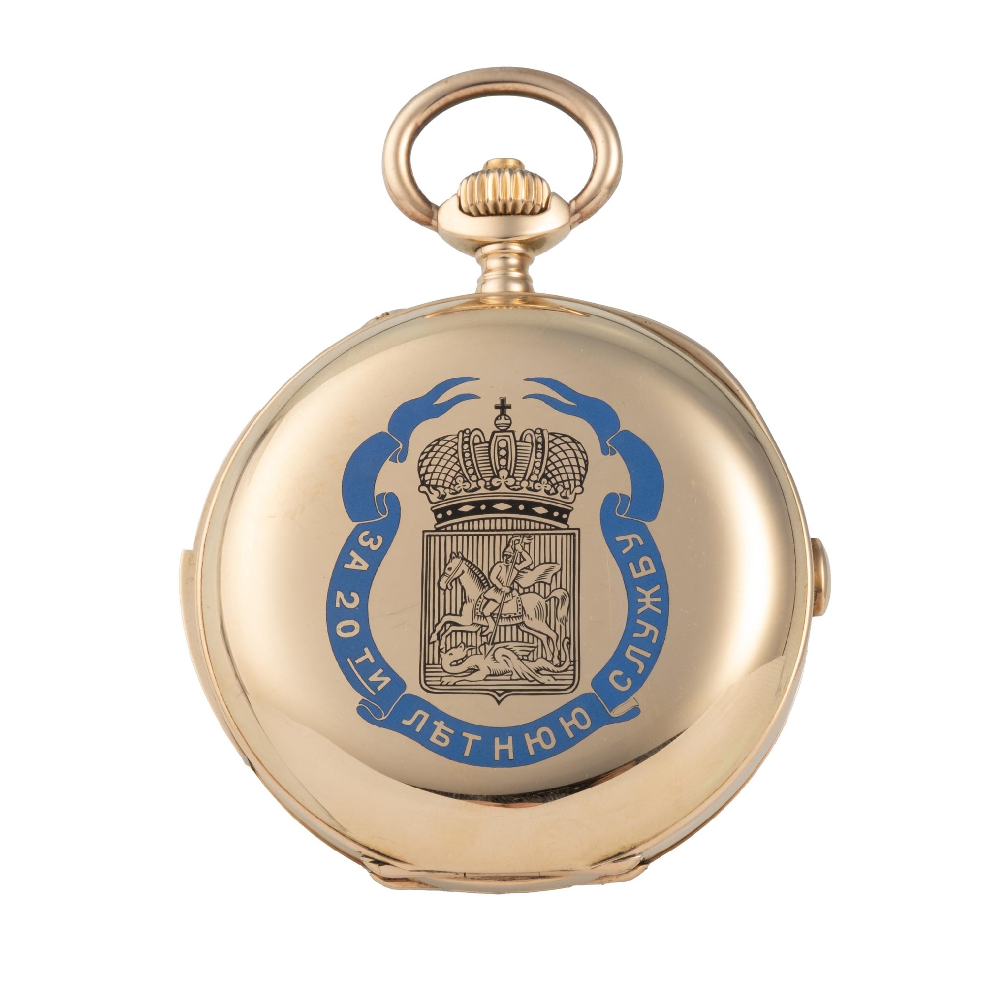A very fine, large and rare, 14k yellow gold, manual wind hunting case, historical keyless-winding presentation pocket watch, made for the Russian market, with minute repeater on two steel gongs and chronograph. Front cover engraved and black champlevé enamel with the Russian Empire’s coat-of-arms, back cover bears the imperial crown and the Moscow coat of arms with the inscription “За 20-лѣтнюю службу” (“For 20 years of service”) in blue enamel. With enamel dial, blue steel Breguet hands.