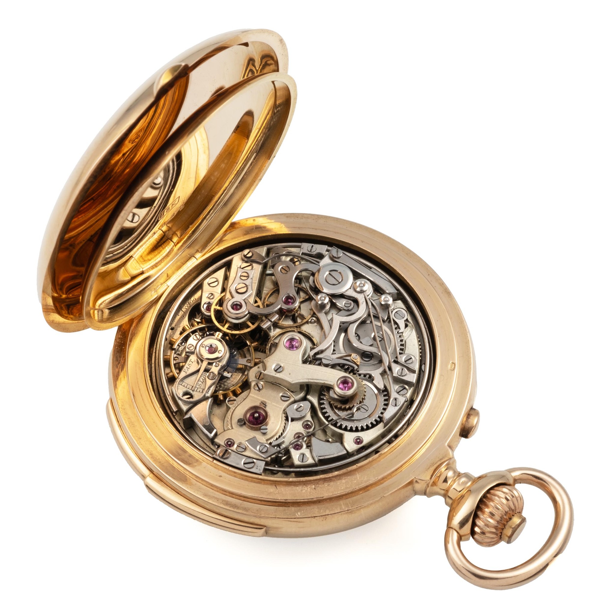 A very fine and rare, 18k yellow gold, manual wind open-face, minute repeating pocket watch, minute repeater, split-seconds chronograph with white enamel dial and blue steel spade hands.
