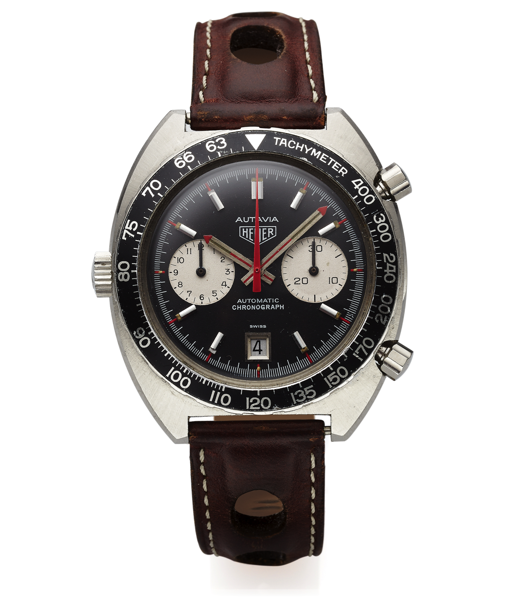 HEUER AUTAVIA STEEL AUTOMATIC CHRONOGRAPH STEEL Heuer "Autavia" Automatic Chronograph. Made in the 1970s. Fine, tonneau-shaped, self-winding, water-resistant, stainless steel wristwatch with round button chronograph, registers, tachometer and date.
