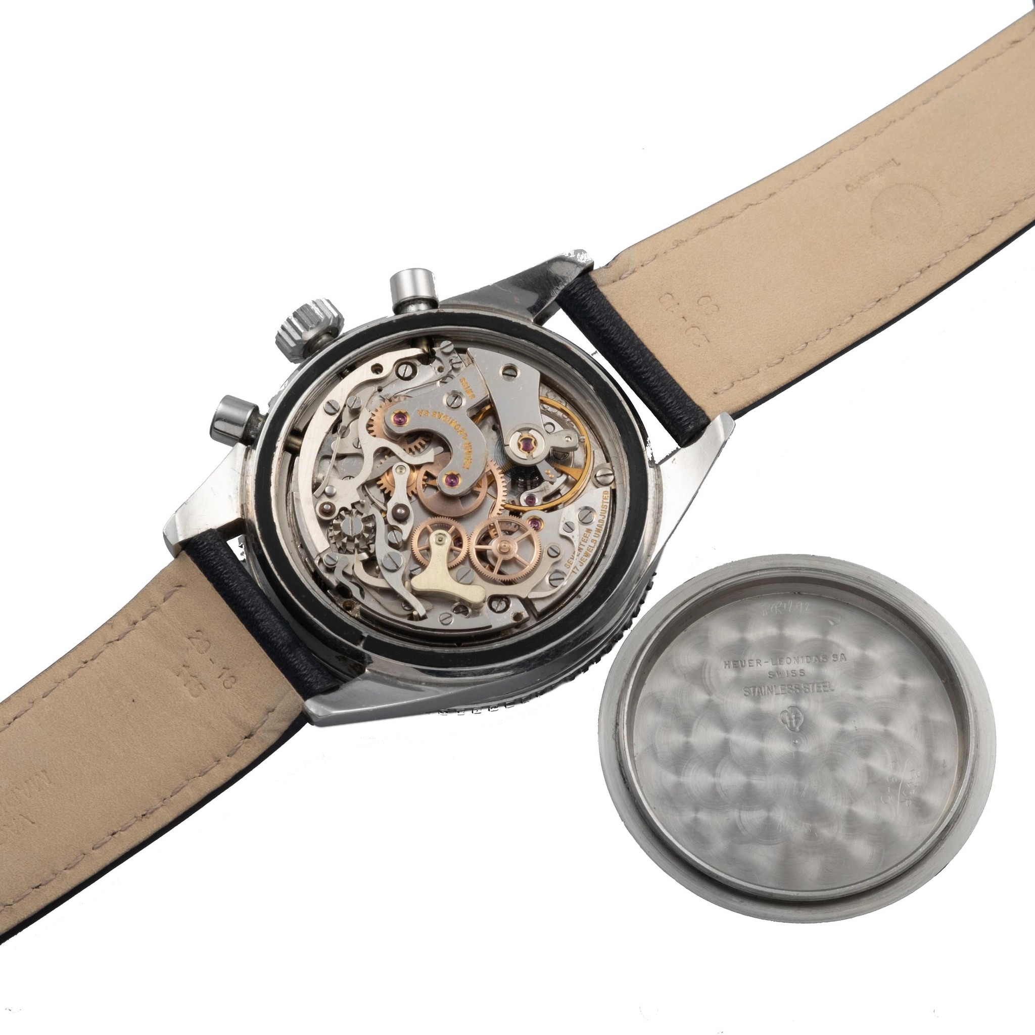 A fine and rare stainless steel manual winding pilot chronograph wristwatch with revolving bezel, black dial and 3 registers