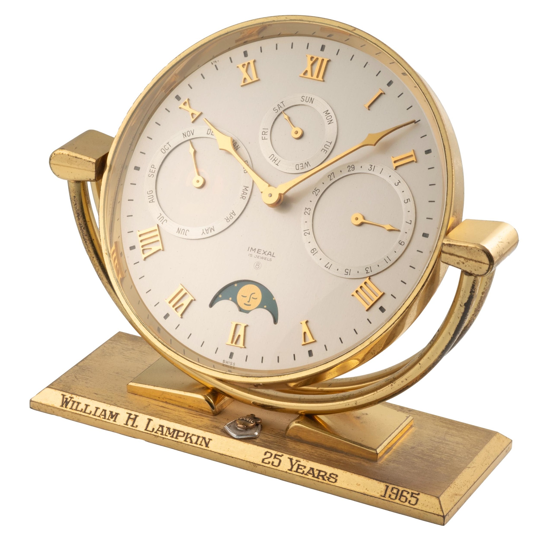 A fine and rare, brass, manual wind 8 day going desk clock with triple date and moonohase, given for 25 years of service to the famous California dairy company ADOHR farms
