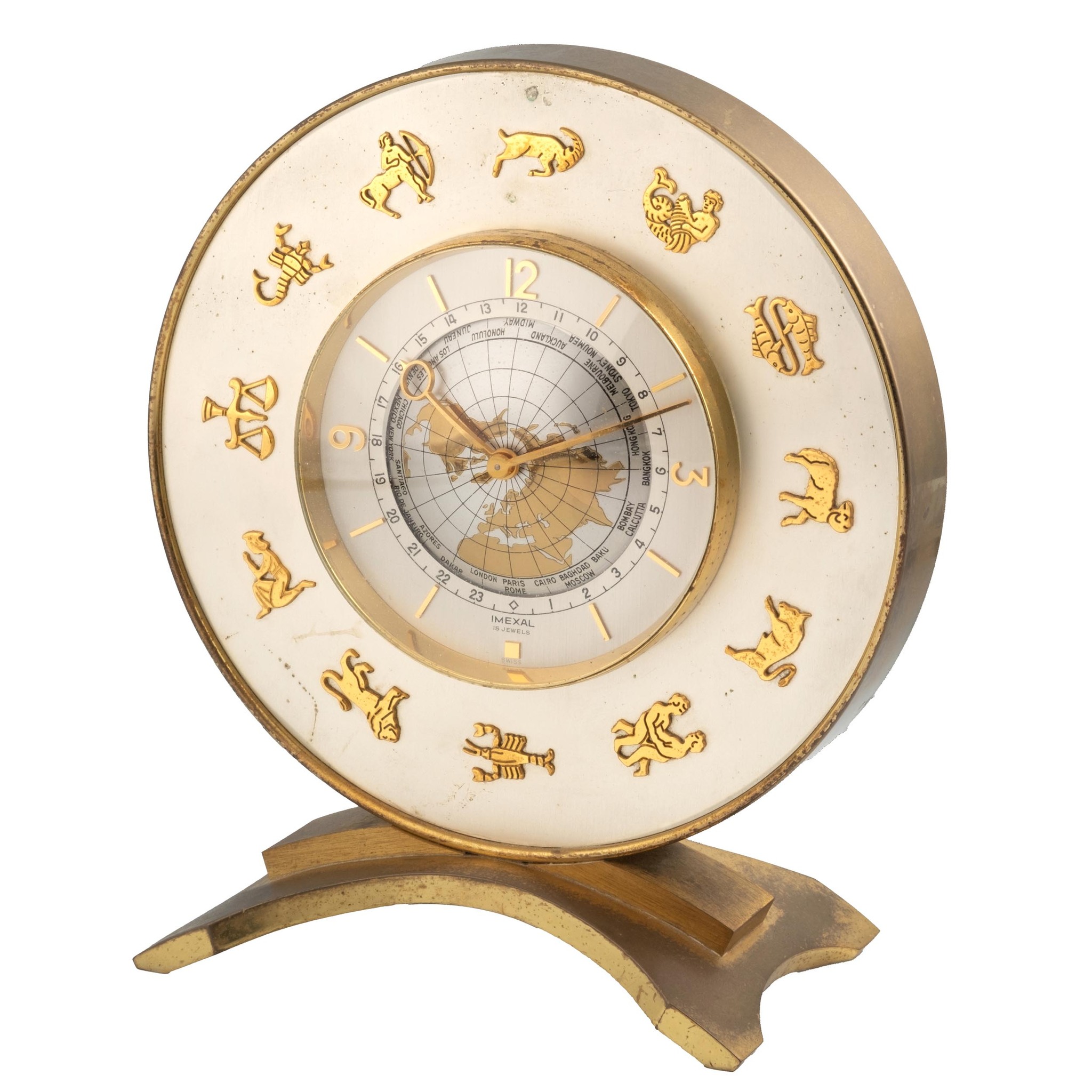 IMEXAL, SWITZERLAND, WORLD TIME WITH ZODIACS, GILT BRASS