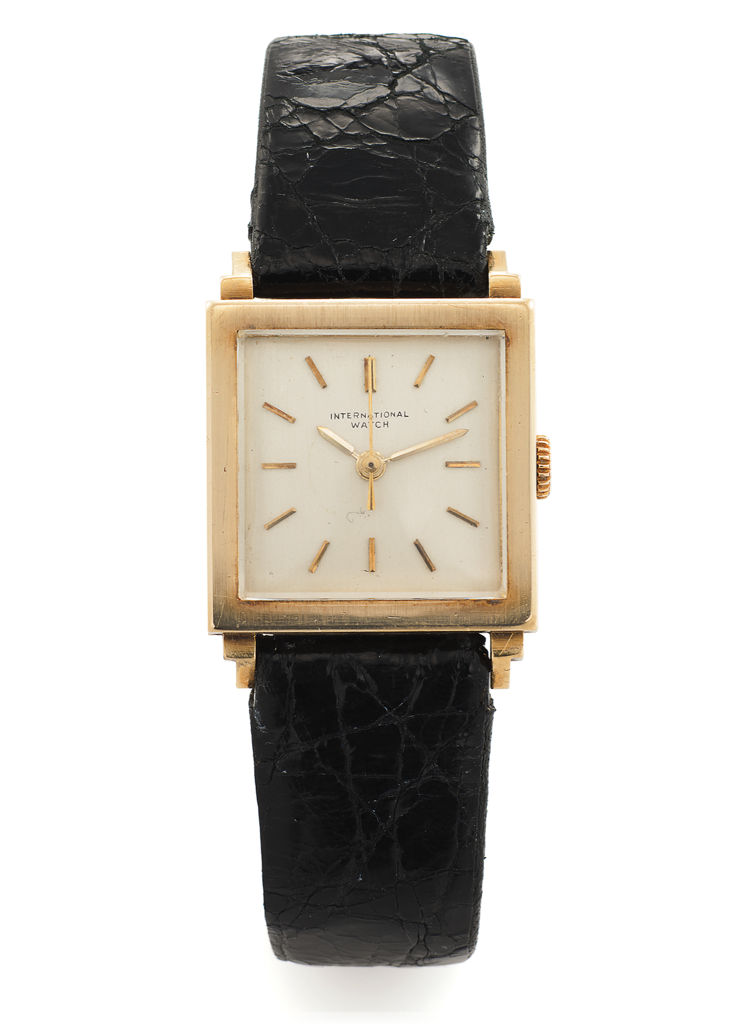INTERNATIONAL WATCH CO SQUARE YELLOW GOLD International Watch Co., Schaffhausen, No. 1405602, case No. 1066. Made circa 1950s. Fine, square, 14K yellow gold wristwatch.