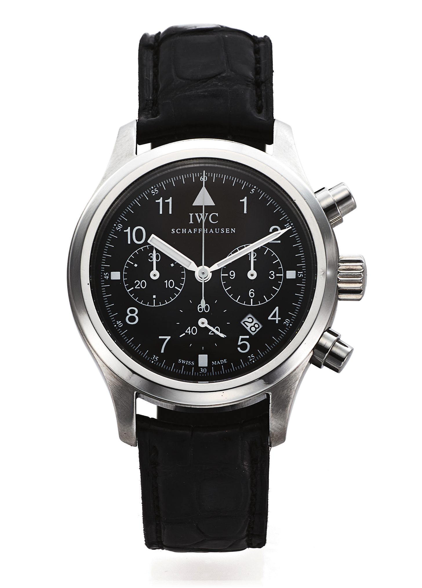 IWC REF. 3740 FLIEGER CHRONOGRAPH STEEL International Watch Co., Schaffhausen, "Der Fliegerchronograph", case No. 2837188, Ref. 3740. Made circa 2000s. Fine, water-resistant, stainless steel quartz wristwatch with round button chronograph with date and a stainless steel IWC buckle.