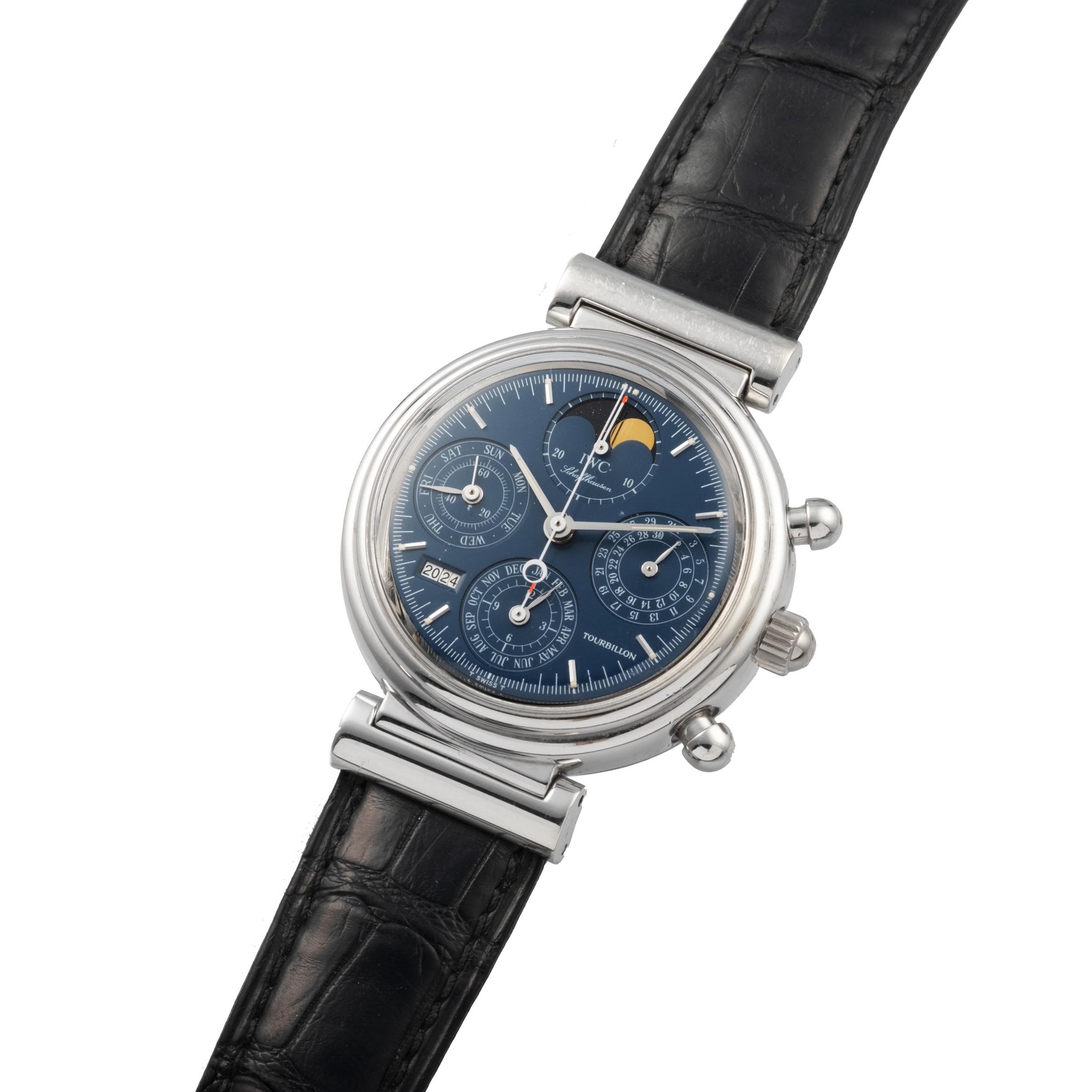 Its platinum case exudes quiet authority, while the silvered dial reveals a masterful orchestration of information: perpetual calendar displays, moon phases, chronograph registers, and the captivating tourbillon visible at six o’clock. Each element reflects IWC’s pioneering spirit and devotion to mechanical precision.