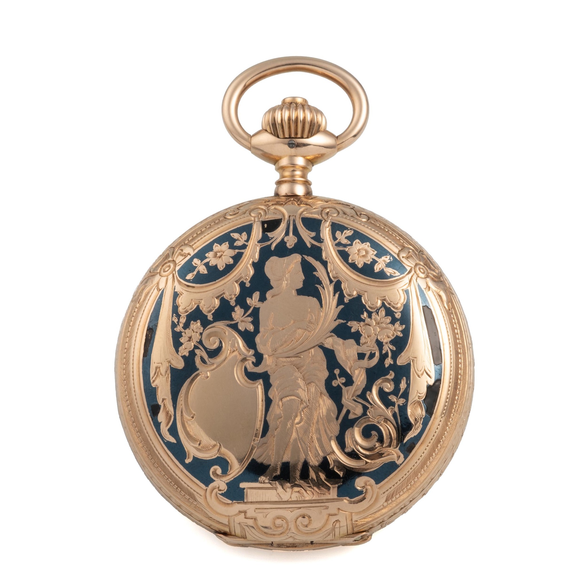 A very fine and rare, 14k pink gold and niello, manual wind hunting-case, keyless-winding pocket watch, with subsidiary seconds at 6, gold hands. Cover and case-back engraved and black niello-work enamelled in champlevé with decoration of friezes, foliages and ornaments; the cover showing Flora, goddess of flowers and Spring, stands on a pedestal with a flower sceptre in her hand; the case-back decorated en suite with, in the centre, a vase of flowers.