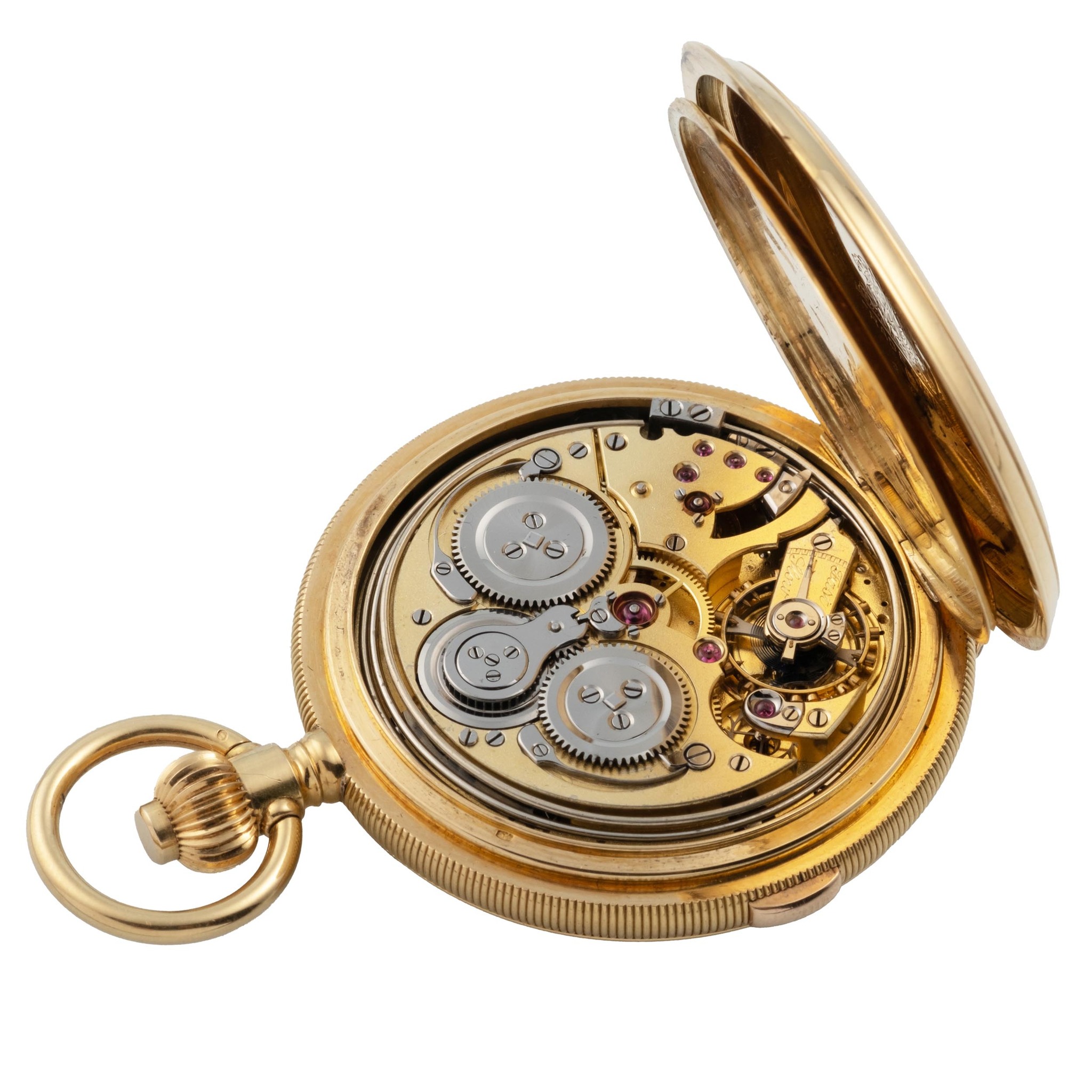 A very fine and rare, 18k gold, manual wind hunting-case, keyless-winding pocket clock-watch, white enamel dial with subsidiary seconds at 6, gold spade hands. Minute-repeater with carillon on three steel gongs by three hammers (activated by the rectangular push-piece at 6 o’clock). Grande Sonnerie (position lever of “Silence” and “Sonnerie” at 1:30), twin-barrel differential-winding.