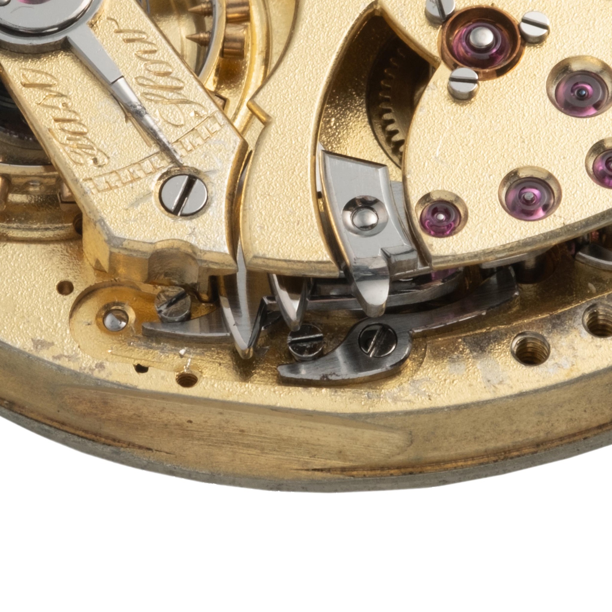 Caliber 45 mm., 26 jewels, gilded brass, straight-line lever escapement, cut bimetallic compensated balance with gold poising screws and blued steel hairspring with terminal curve, polished steel index regulator; repeater work on the main plate, under the dial, with silent centrifugal force governor to regulate the speed of the repetition mechanism.