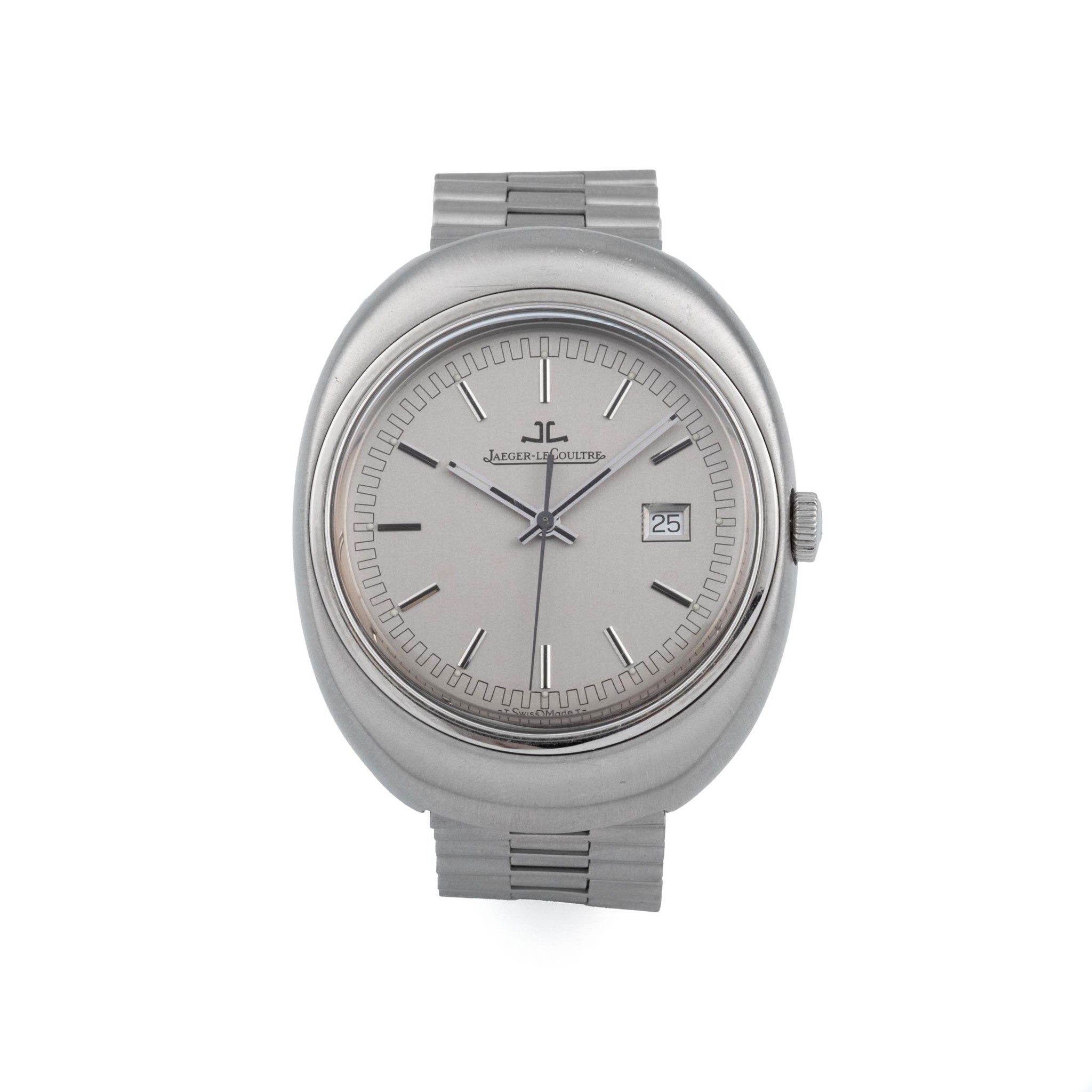 A fine, stainless steel, quartz center seconds, quartz, stainless steel wristwatch with date. Polished and brushed, hooded lugs, screw down case back, raised crystal. Silver, with applied faceted steel square indexes, aperture for the date at 3.