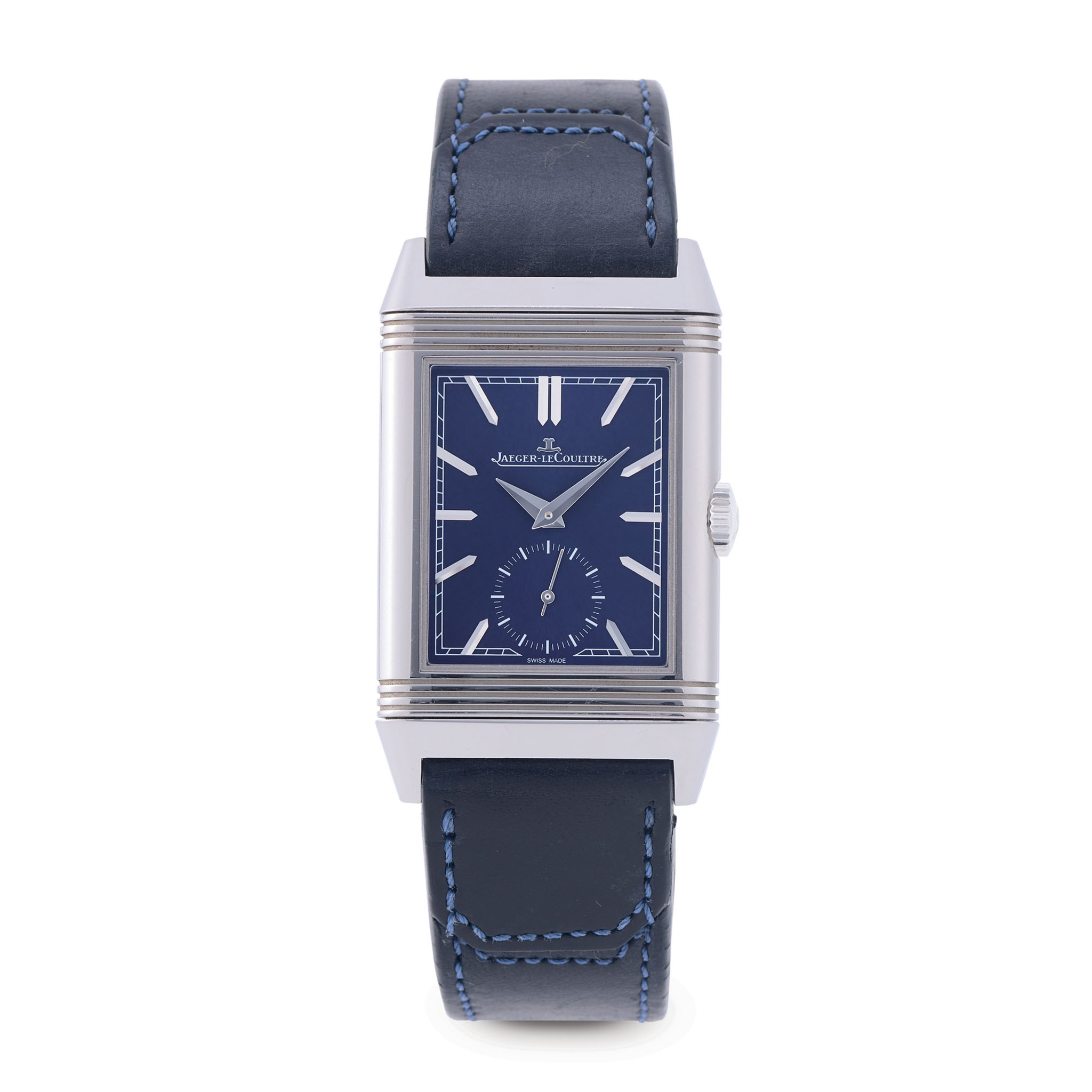 A fine and elegant, manual winding, small seconds at 6, stainless steel reversible wristwatch with blue dial in Art Deco style.