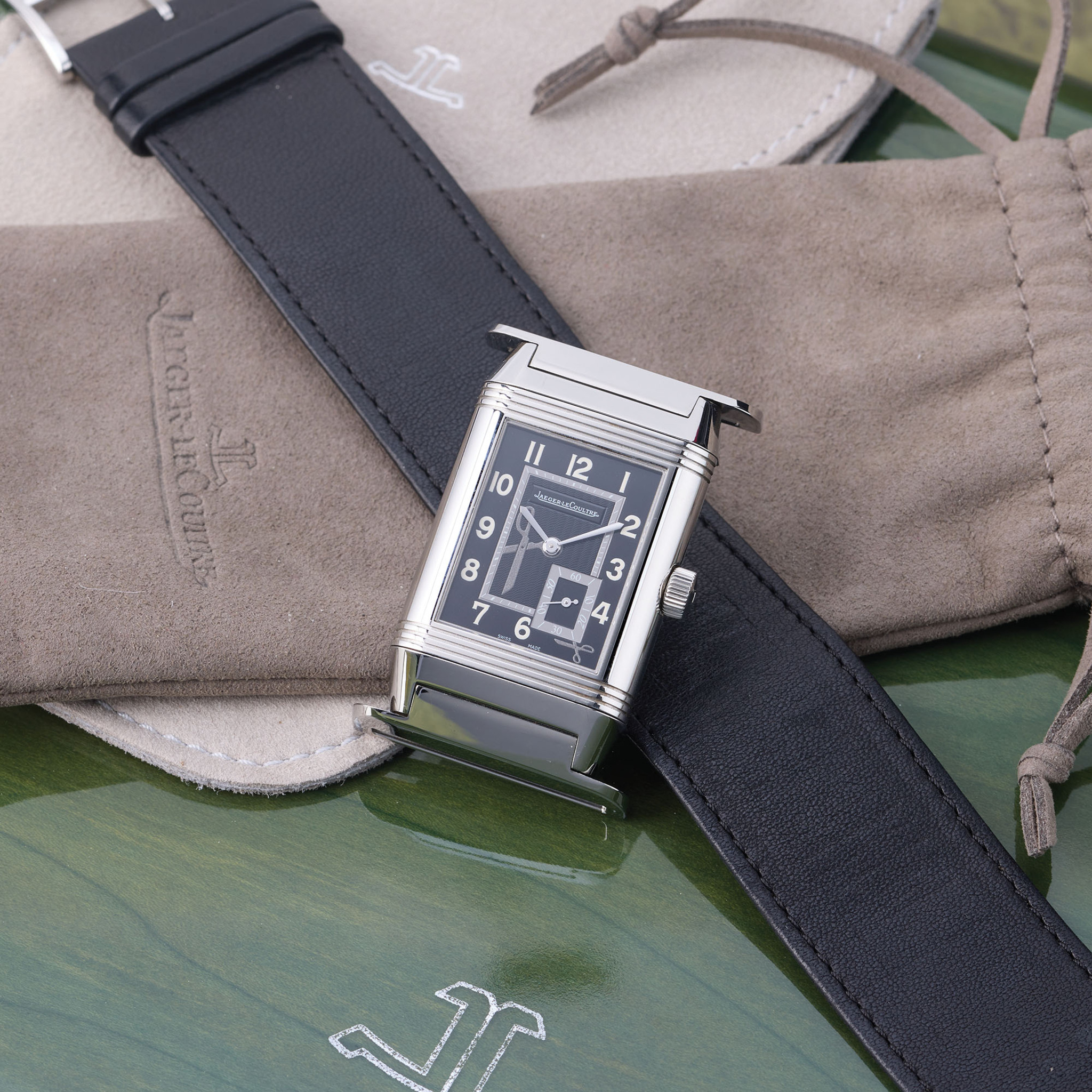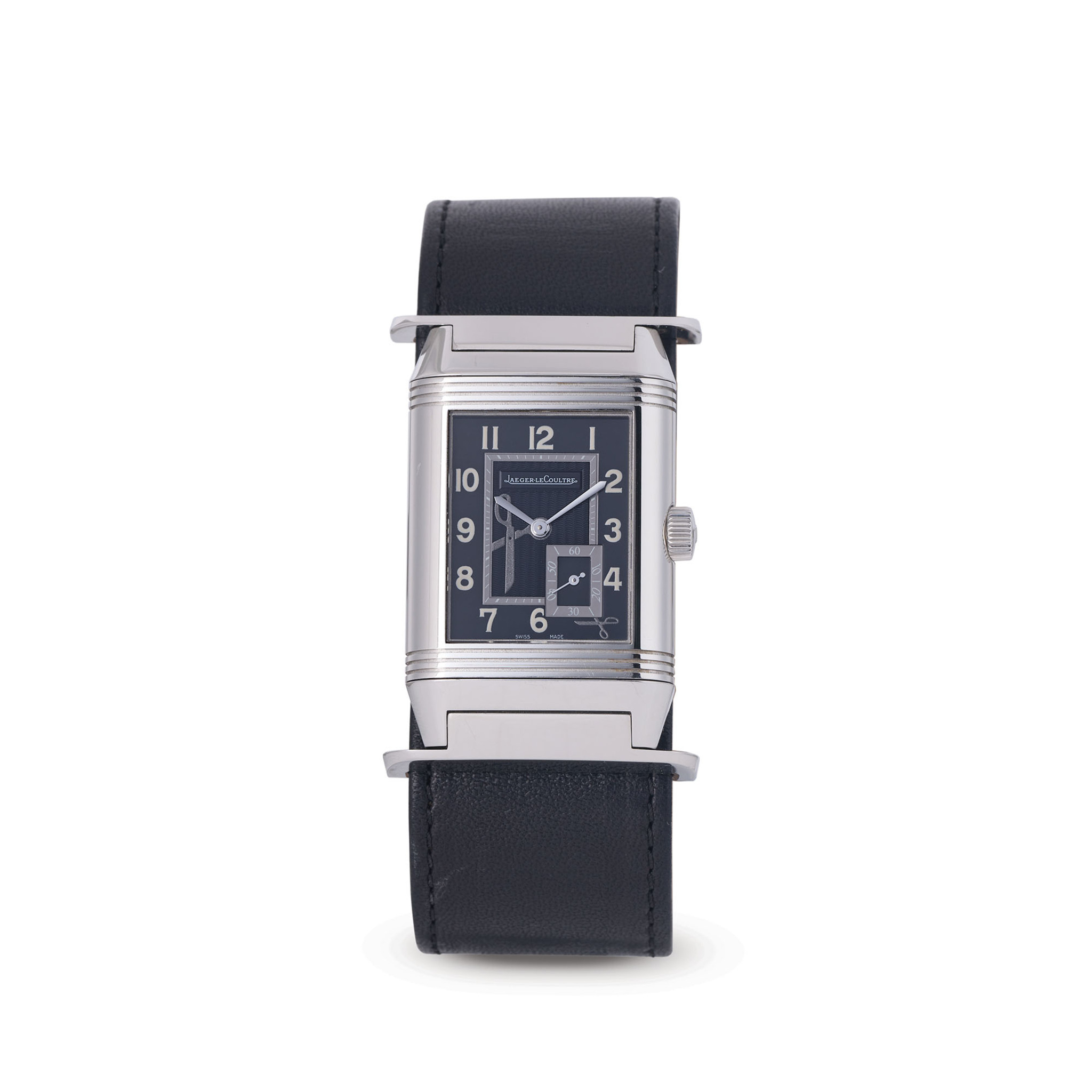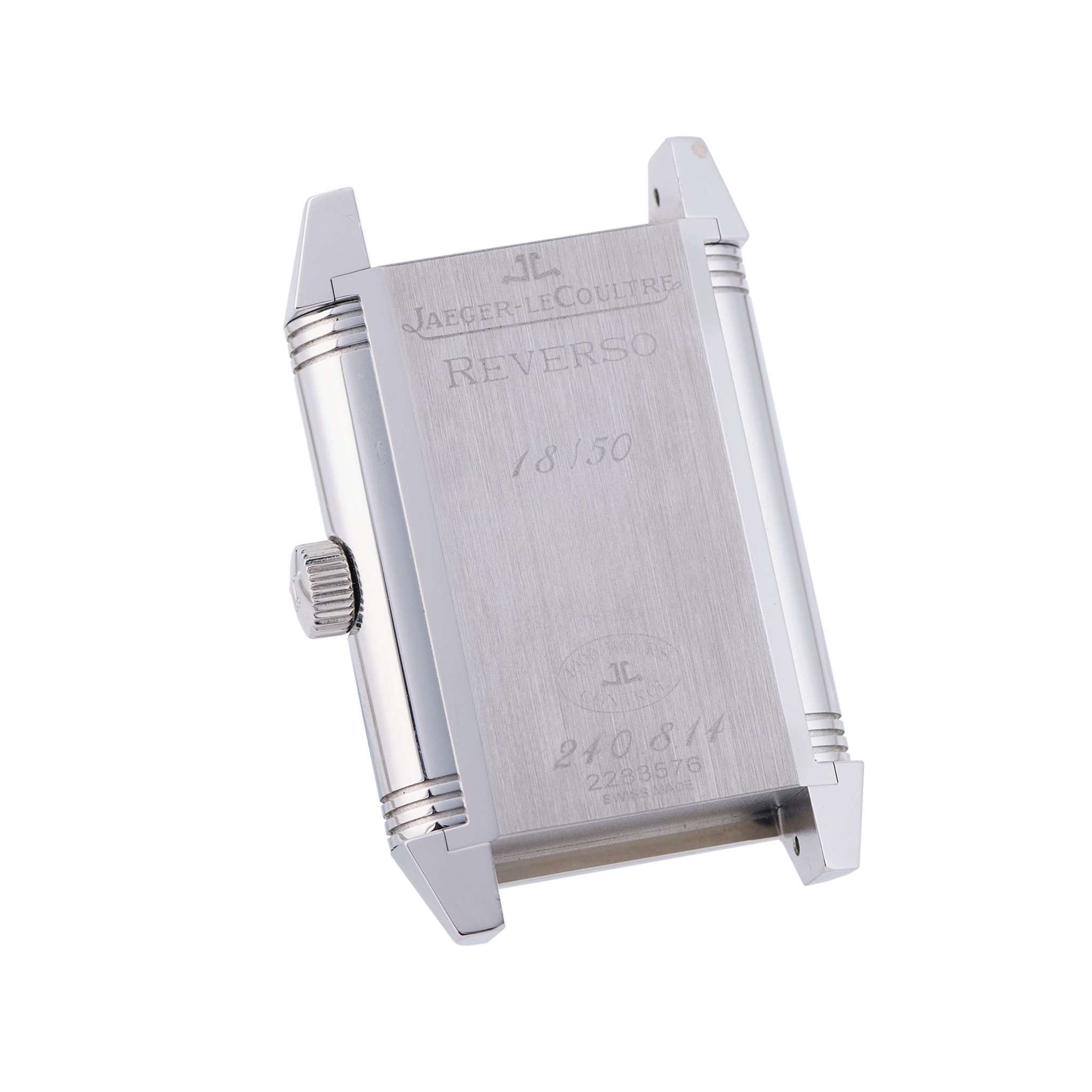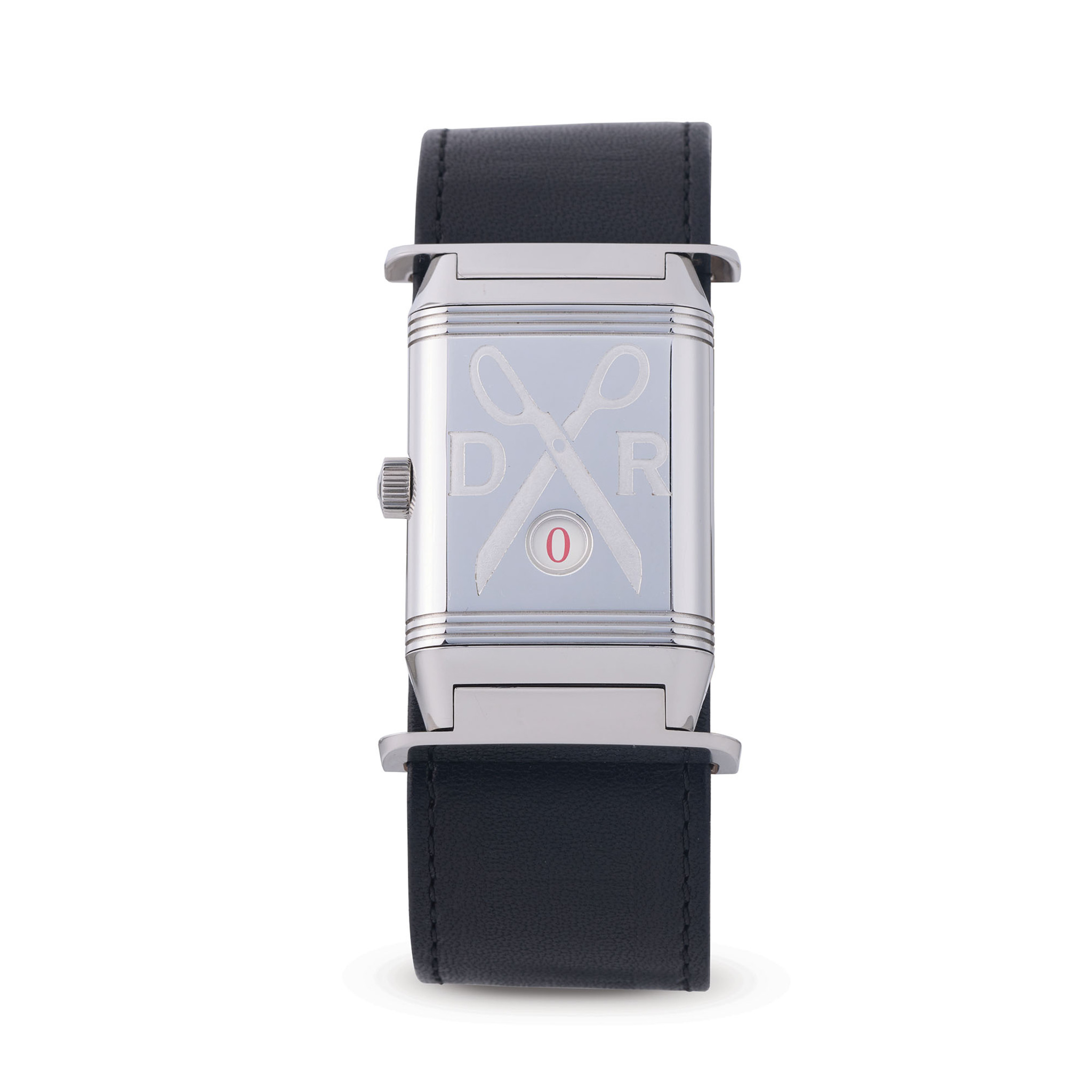 A fine and rare, stainless steel, manual winding reversible wristwatch with subsidiary seconds at 5, 8 days power reserve indicator on the caseback, dial and caseback engraved with the designer’s iconic signature “scissors”. A limited edition of 50 pieces, co-created with designer Dr. Romanelli, made to celebrate the Reverso’s 75th anniversary.