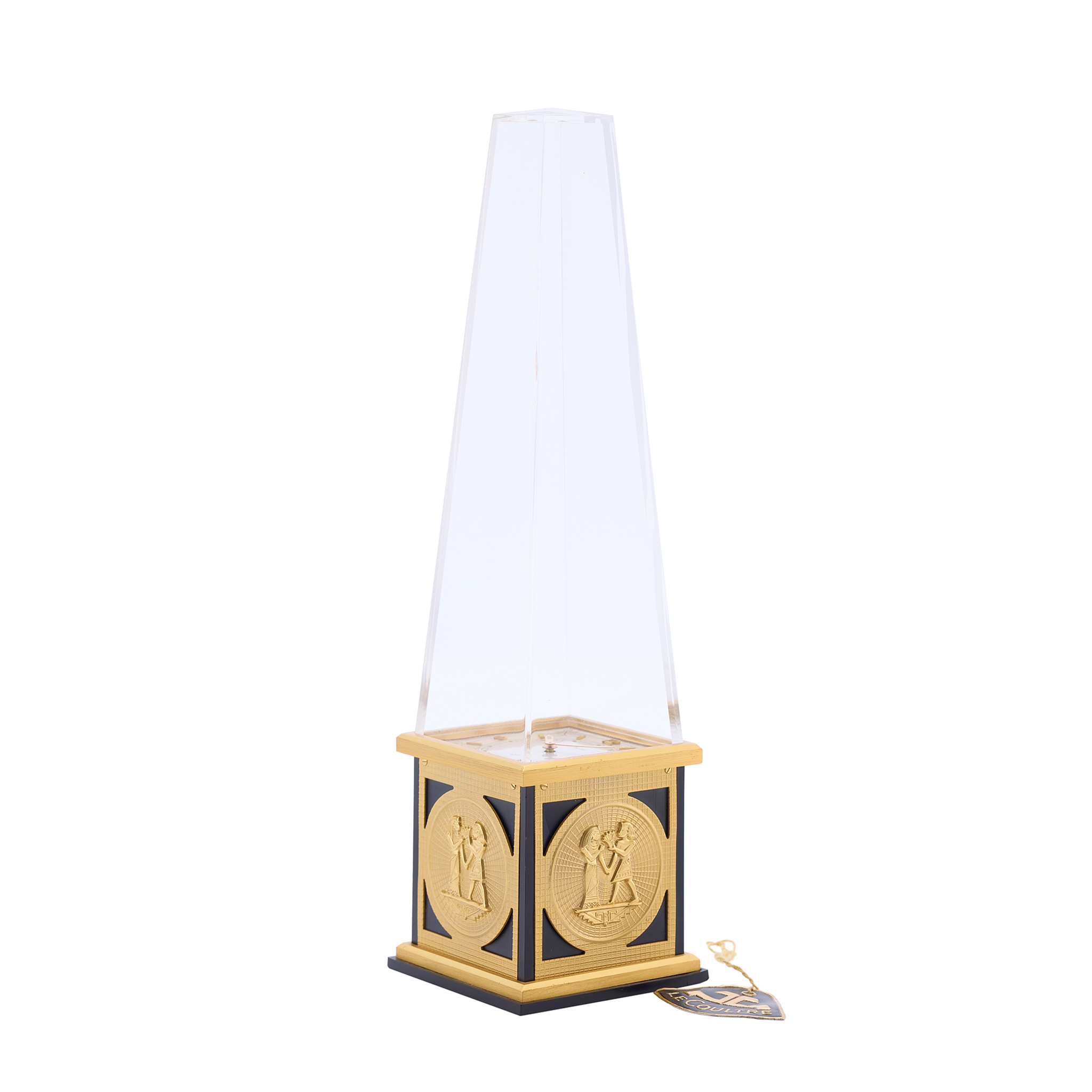 A fine and rare gilded brass, plexiglass, manual winding 8-days going, vertical table clock in the shape of an ancient egyptian obelisk; base decorated with egyptian-style motifs in relief, each side with a female and male figure holding wheat; silver colour dial with four egyptian-style birds on each corner.