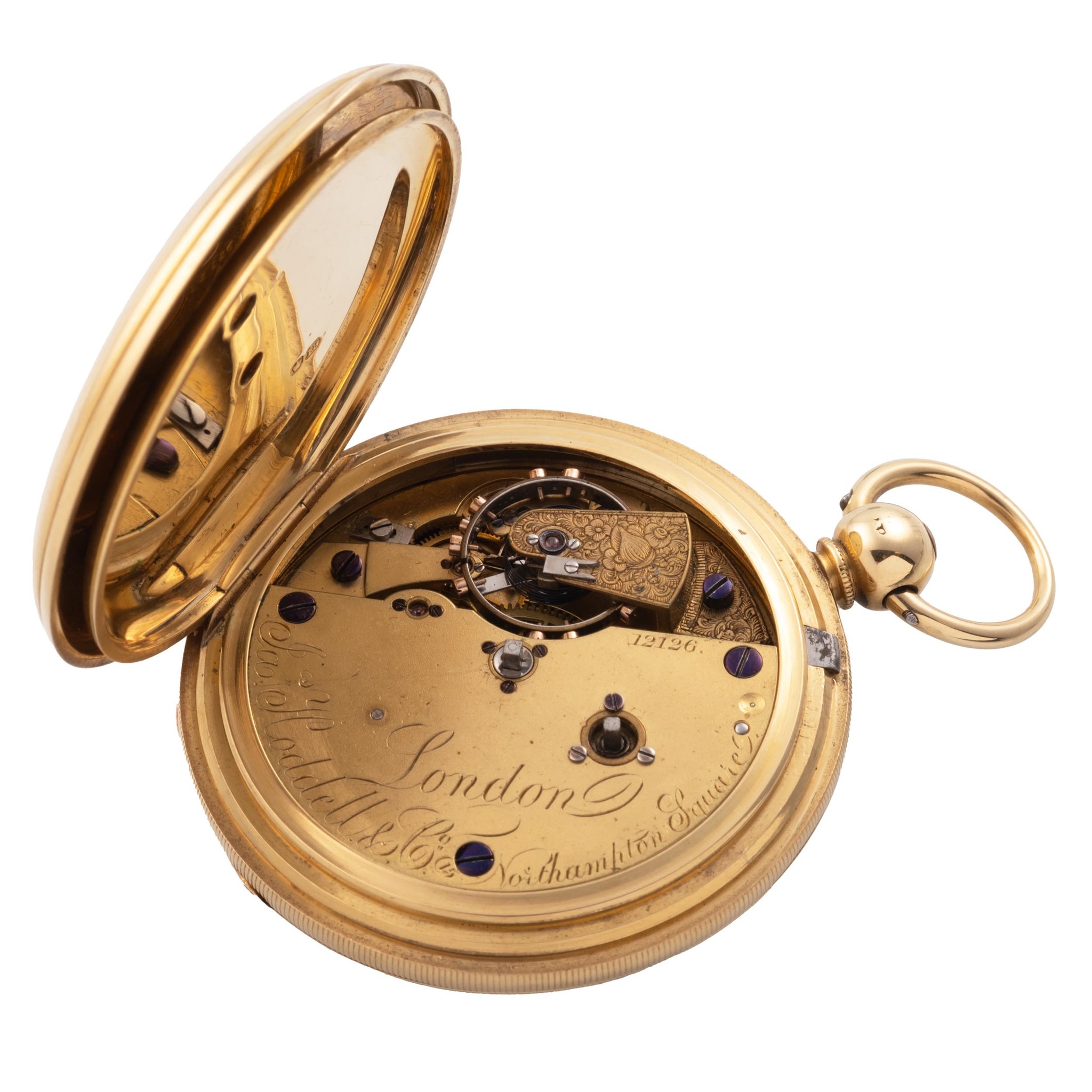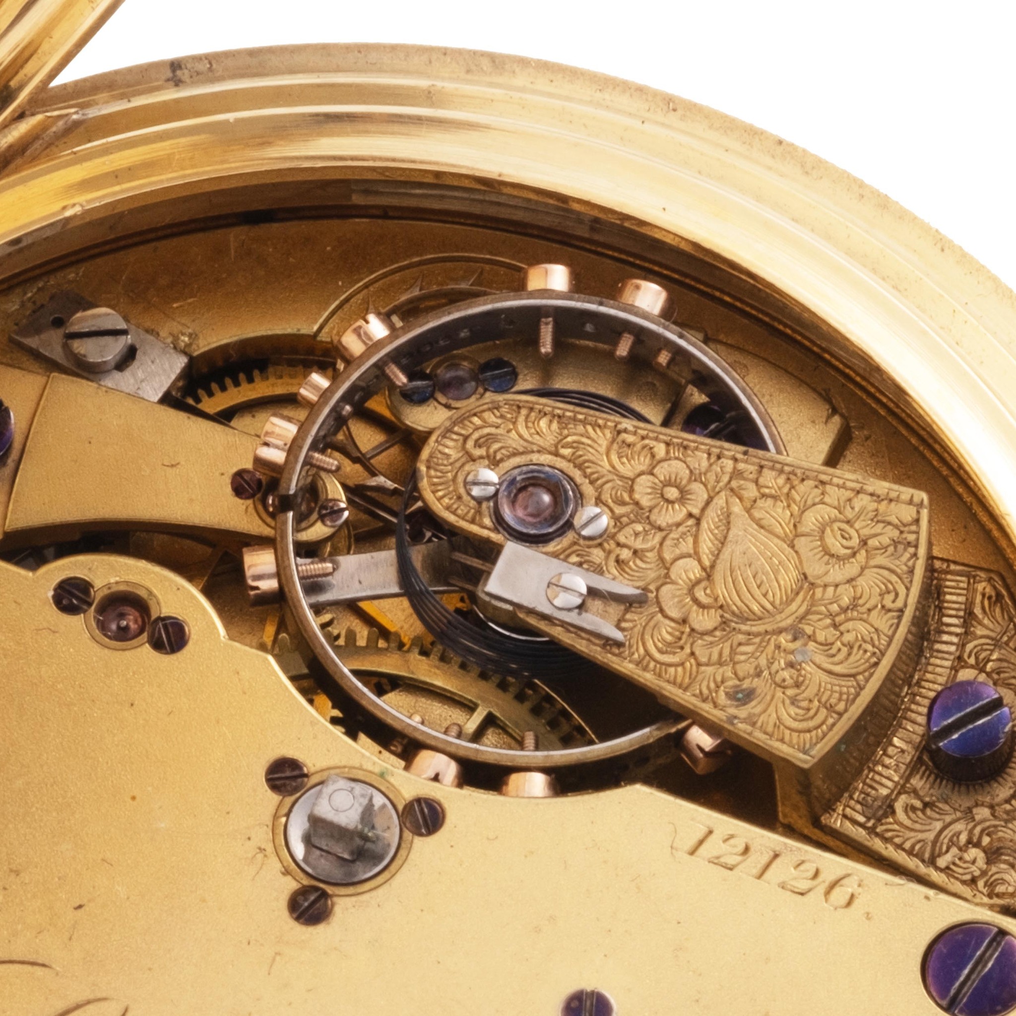 A fine, 18k yellow gold, manual wind hunting-cased keyless pocket watch with enamel dial, blue steel spade hands. Chronometer movement with detent escapement and free-sprung helical spring.