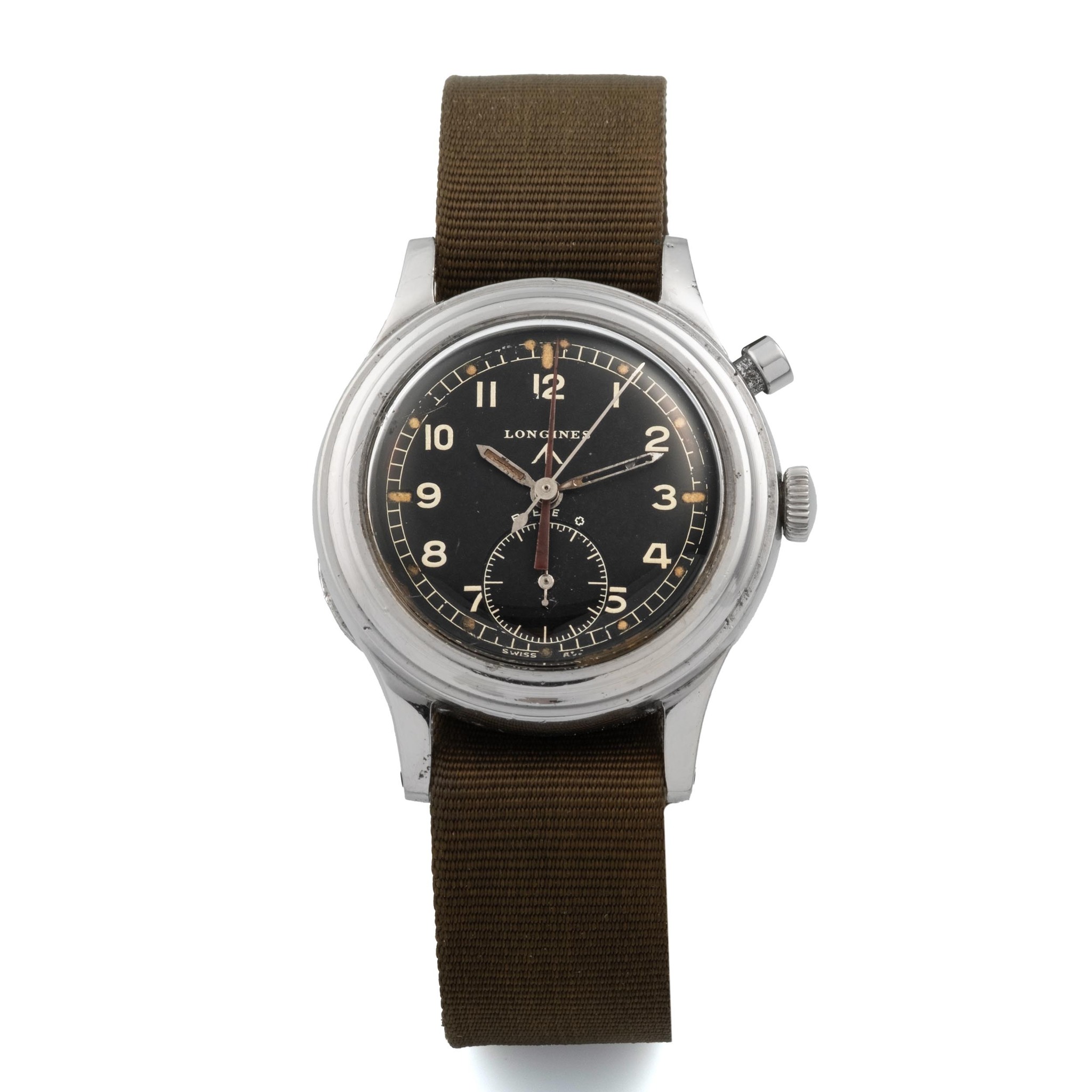 A fine, rare and attractive, stainless steel, manual wind flyback chronograph wristwatch with central minute counter